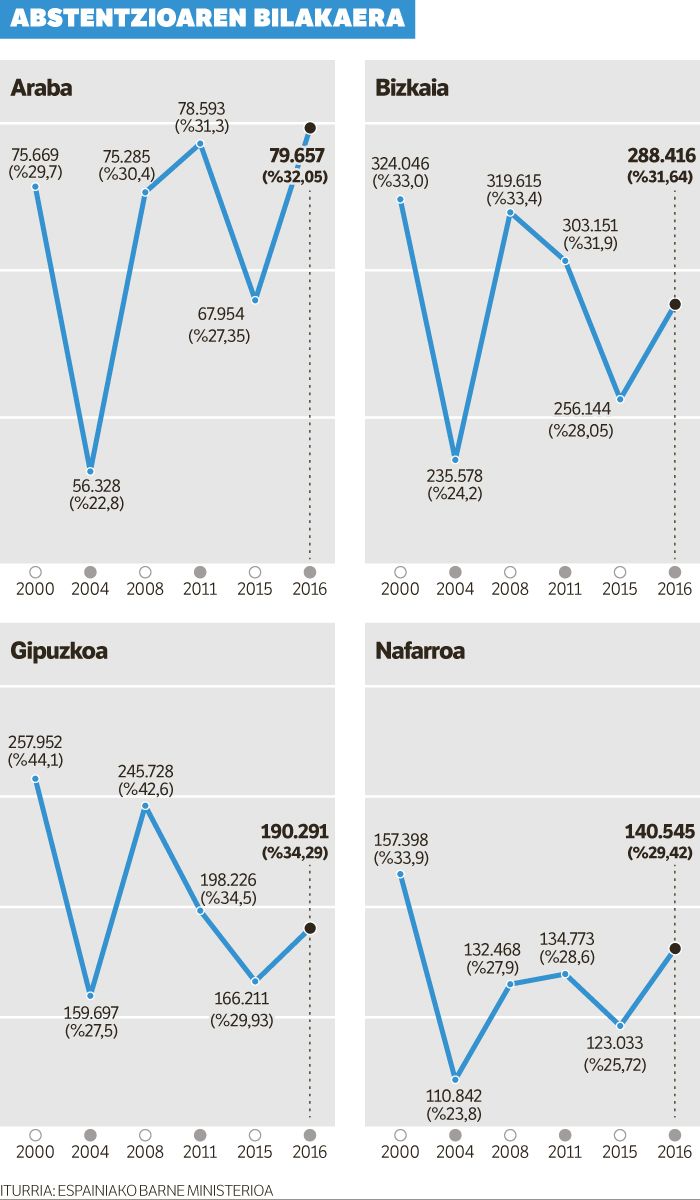 Abertzaleak Madrilen eragiteko ahalmenik gabe geratu dira berriz ere. PP nagusi atera da -lau puntu eta hamalau diputatu igota, gainera—, baina ez du nahikoa babes Ciudadanosekin batera Kongresuan gehiengo osoa izateko: 169 diputatu bien artean —abenduan, 163—, eta gehiengo osorako 176 behar dira. Zentrotik ezkerrerako blokeak, 156 diputatu ditu —lehen, 161—. EAJk eta EH Bilduk kanpainan esaten dute Madrilera eragitera joan nahi dutela, baina ez dute horretarako nahikoa indar. Katalanek bai —ERCk eta CDCk berriro 17 diputatu—, baina haien baldintza onartezina da PSOErentzat: erreferenduma. Estatuan ere lehengo argazki bera dago hor.