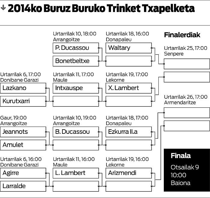 Waltary da lehen adarreko zerrendaburua, eta aurretik partida bakarra dago, Peio Ducassouk eta Herve Bonetbeltxek gaur zortzi jokatuko dutena. Adar hori, Ximun Lanbertenarekin gurutzatuko da finalerdietan. Adar horretako lehen partida Bixente Lazkanok eta Andde Kurutxarrik jokatuko dute. Kurutxarriren aurreneko partida izango da bizkarreko arazoen ondorioz urtebetez geldirik egon ondoren. Irabazleak Alexis Intxauspe izango du hurrengo kontrario.