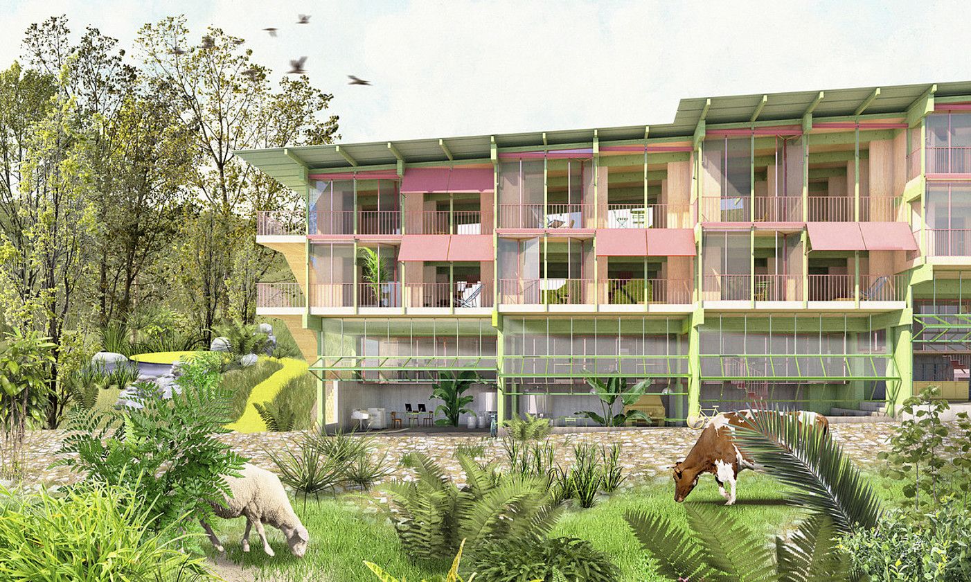 Jatorrizkoaren ezaugarri batzuk hartuta, «baserri berri baten tipologia» planteatzen du Rhizomak, Garbizuk azaldu duenez, batik bat landa eremuetan koka daitekeena. Itxura baztertu dute, ordea. «Ez zitzaigun interesatzen bi mazelako teilatua, tamaina, estetika...». Hala, lehen begiratuan, diseinuak ez dakar baserria gogora, erabilerari erreparatu baitiote, nagusiki. «Etxebizitzari alde produktibo bat gehitzea zen printzipalena; lanak etxean txertatuta egon behar zuen».
