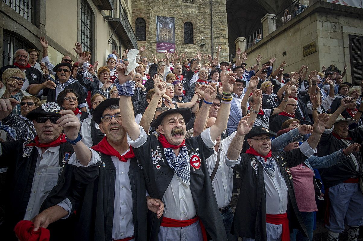 Beteranoak, bai, baina antolatuak, ere bai. Goiz osoa betetzeko egitaraua badute blusek eta neskek. «Dantzatzea eta jatea da jende honek buruan duen bakarra», esan du Gonzalez de Aspuruk, irribarrez. San Migelgo eginkizunak amaituta, badoaz Plaza Berriko dianetara, udal bandarekin. Ondoren, Artepan okindegiak txoripana eskainiko die, eta handik, kalejiran joango dira Ateen Iturriraino, bigarren mokadu bat hartzera. Animatu direnek elkarrekin bazkalduko dute Manuel Iradier kaleko jatetxe batean.