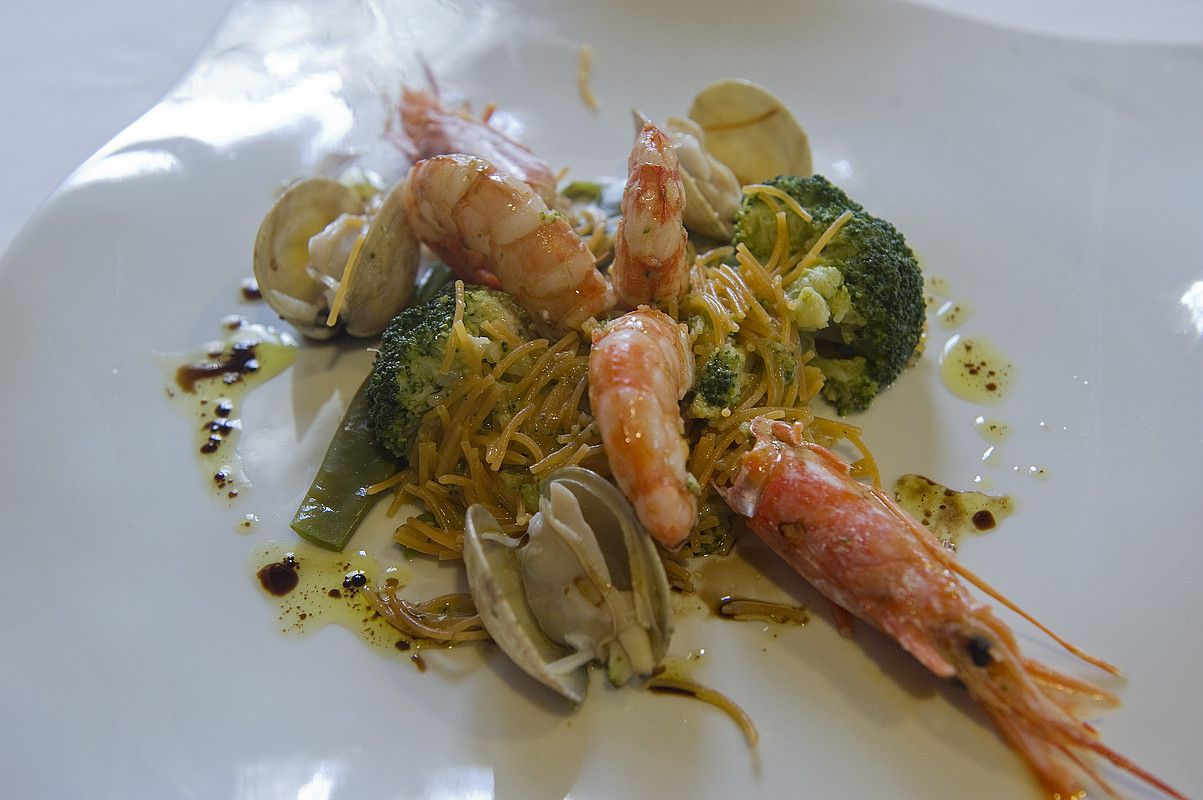 • Jarraian, tipulinak eta azenarioak zuritu eta karratu txikietan moztu. Paella ontzi motako zartagin zabal batean txorrotada bat oliba olio jarri, eta su motelean 15 bat minutuz erregosi. Ondoren, txanpiñoiak gehitu, aurrez xerra finetan moztuta, eta jarraian, beste osagai guztiak gehitu: ziazerbak juliana eran moztuta, tomatea dado forman moztuta eta zainzuriak erditik moztuta. Osagai horiek guztiak zartaginean ondo nahastu, eta azkenik fideoa gehituko dugu. Jarraian, otarrainxkak txukun ipini zartaginaren bueltan, eta salda gehitu, fideoa estalita gelditu arte. Ondoren, su bizian irakin 5 edo 6 minutuz. Eta jateko prest daukagu. Prestatu bezain laster jatea komeni da, bestela fideo pasta itsatsita geldituko da.