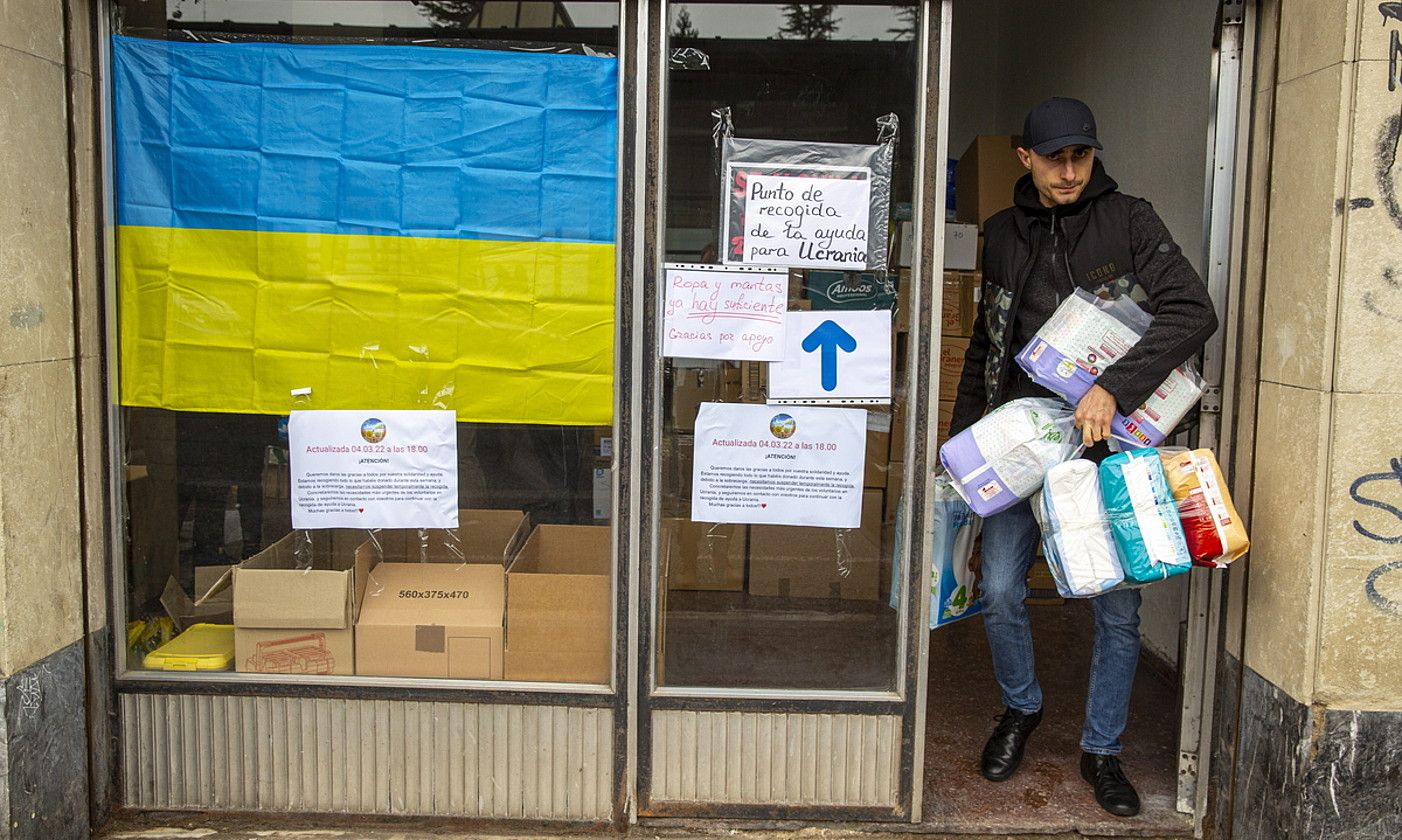Administrazioen funtzionamendua geldoagoa da, beste mekanismo batzuk dituzte, eta haiek martxan jarri baino lehen hasi ziren antolatzen Ukraina-Euskadi lankidetzarako elkarteko kideak. Haiek izan ziren elkarretaratzeak antolatzen lehenak, baita bilketarako guneak jartzen, horren berri sare sozialen bidez ematen, eta erantzunaren neurriaz ohartzen lehenak ere. «Euskal herritarren erantzuna hainbesterainokoa izan da non gainezka egin dugun. Ez genuen halakorik espero», aitortu du Liuda Gortovliukek, larriaren eta esker onaren artean. Ukraina-Euskadi elkarteko kidea da, eta urteak daramatza Eibarren (Gipuzkoa). «Asko eskertzen dugu. Jendea zoragarria da. Kalean gelditu, eta galdetzen didate ea noiz hasi behar dugun berriz: jendeak kolaboratu egin nahi du».