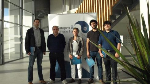 Donostiako Enertic eraikinean sinatu dituzte hitzarmenak Joanes Maiza (GoiEner), Alejandro Arizkun (Som Energia), Mertxe Aizpurua (Udalbiltzako lehendakaria), Javier Zardoia (Som Energia) eta Patxi Bergarak (I-Ener).