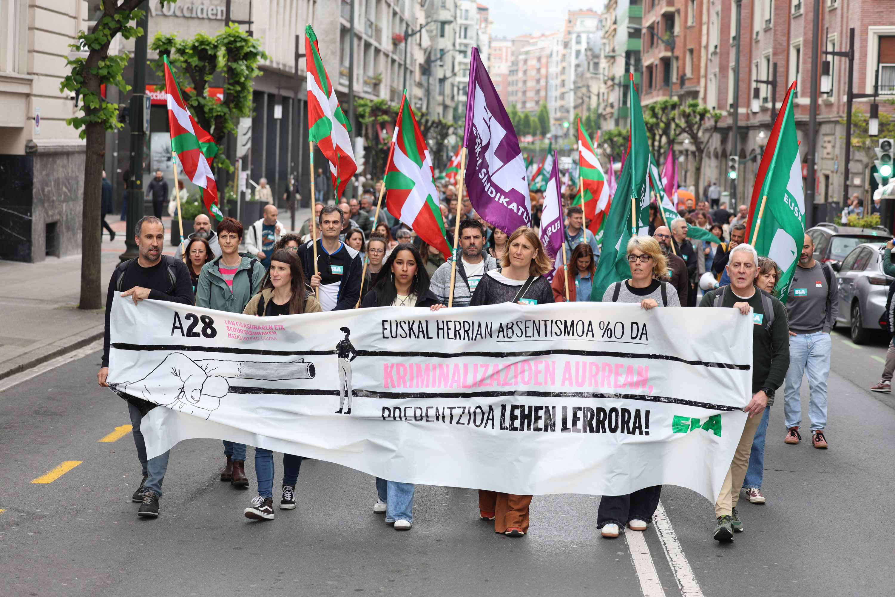Ekitaldia amaitutakoan, ELAko kideen manifestazioa egin dute Alondegitik Eusko Jaurlaritzaren egoitzaraino. Euskal Herrian absentismoa %0 da eta Kriminalizazioaren aurrean, prebentzioa lehen lerrora leloak idatziak zituen pankarta baten atzetik, ehunka lagunek zeharkatu dituzte Bilboko kaleak, «Ez, ez, ez, lan istripurik ez», «absentismoa, aitzakia», «gure osasuna, lehentasuna» eta antzeko oihuak eginez.