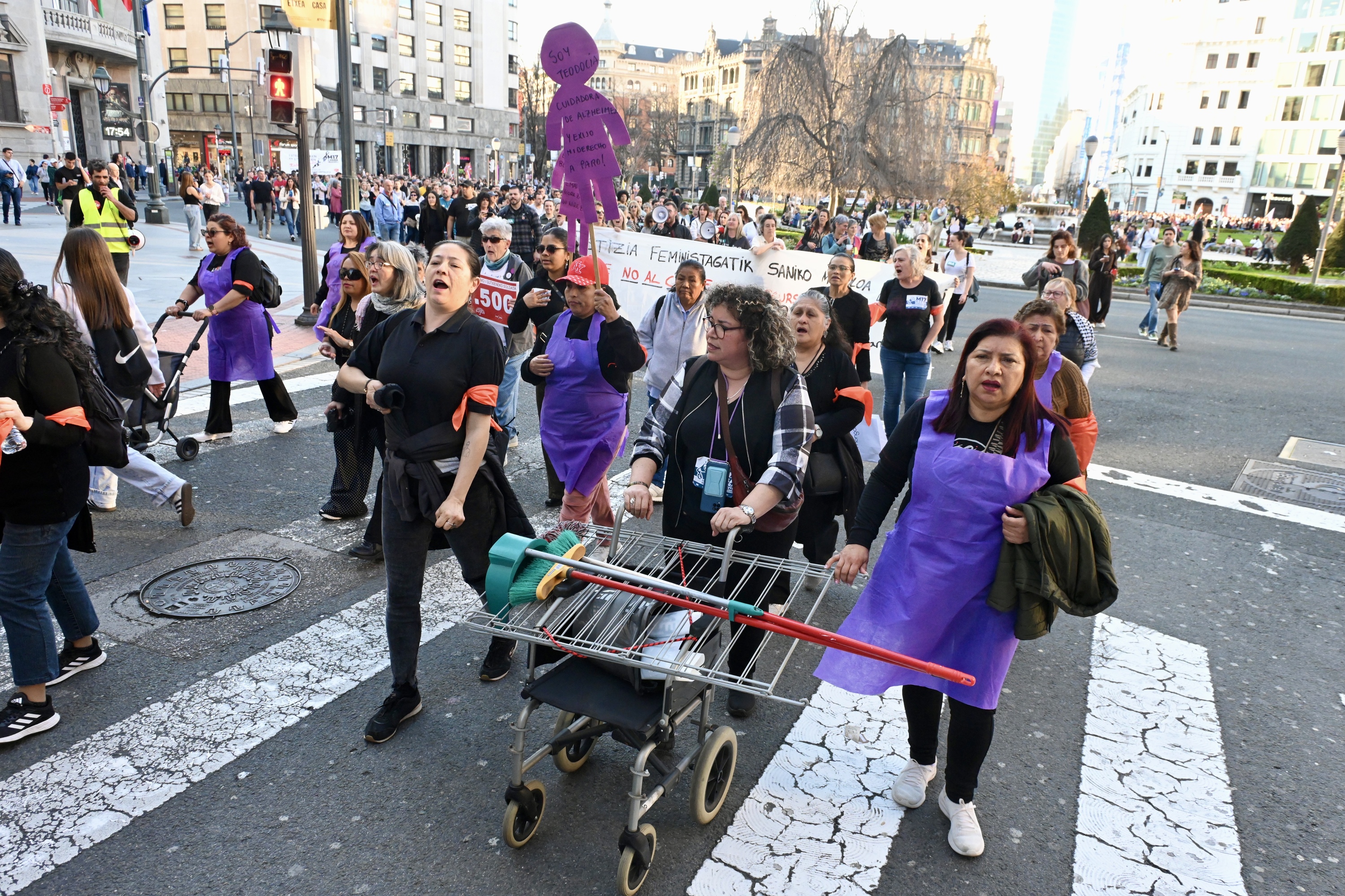Trapuz beteriko esekitokia, orgatxo bat, gurpil aulkia, erratzak eta lanbasak. Ezohiko itxura hartu du Bizkaiko Foru Aldundiaren jauregiaren aurreko espaloiak, arratsaldeko manifestazioa hasi baino minutu batzuk lehenago. Lehen lerroan daude etxeko langileak, tinko, harro. Haietako askok kartoizko panpinak ere eramaten dituzte, grebara batzerik izan ez duten lankideak gogoan.