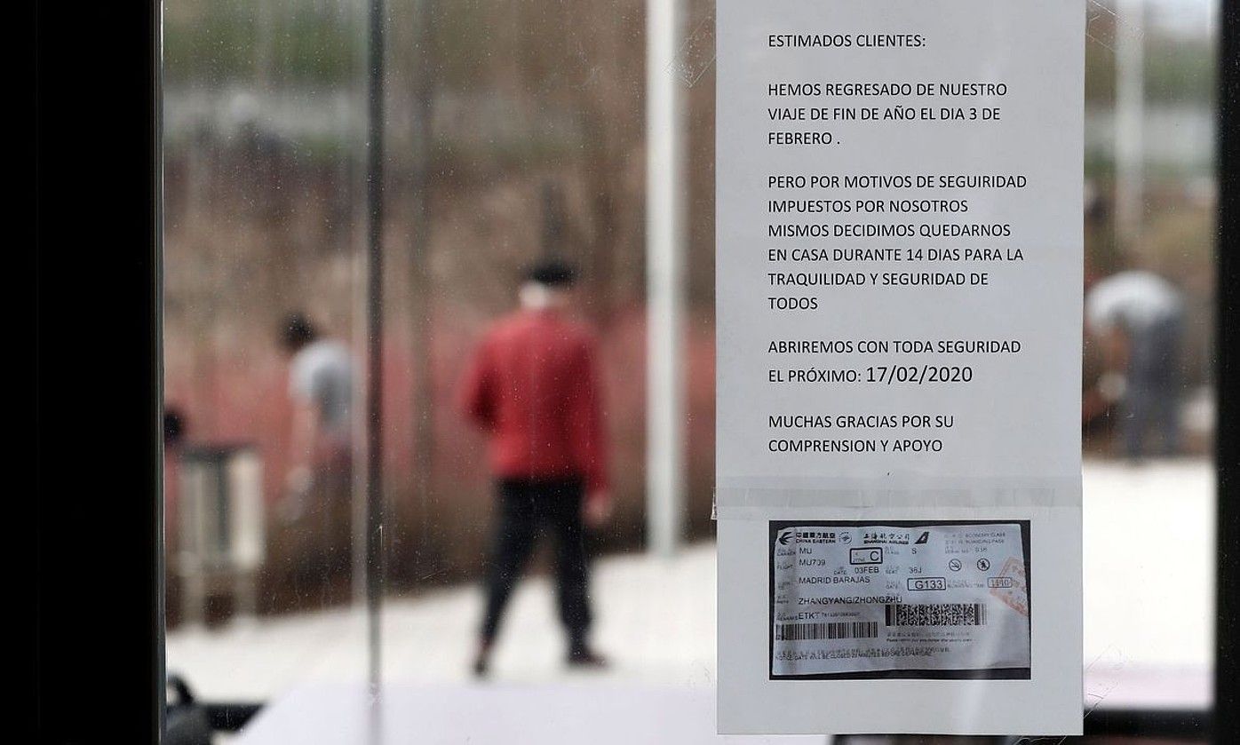Txinatarren Urteberri eguna ospatzetik jaioterritik Euskal Herrira bueltatu zirenean —urtarrilaren 25ean izan da aurten—, koronabirusa dela-eta bi asteko berrogeialdia egitea erabaki zuten Mutiloagoitiko (Nafarroa) taberna baten jabeek. OME Osasunaren Mundu Erakundearen arabera, bi aste behar dira, gehienez, birusa inkubatzeko. Beraz, ugazaba txinatarrek lokala itxita eduki zuten hilaren 3tik 17ra. Jakinarazi zutenez, «segurtasunagatik» hartu zuten erabakia. Xinjie Chen Euskadiko Txinatarren Elkarteko kideak, ordea, «xelebre» deitu die hori egin zutenei. «Gehiegikeria bat da. Gu nahiko lasai gaude. Gure artean ez da sortu asaldura nabarmenik».