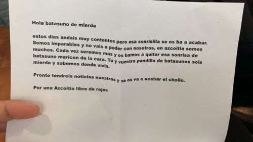 "Oso pozik zabiltzate egunotan, baina irribarre hori joan egingo zaizue. Geldiezinak gara, eta ezin izango diguzue aurre egin; asko gara Azkoitian. Gero eta gehiago gara, eta zuen irribarre marikoia eta batasunoa kenduko dizuegu. Zu eta zure kuadrilla batasunoa ez zarete deus, eta badakigu non bizi zareten. Laster izango duzue gure berri, eta orduan amaituko zaizue pagotxa. Gorririk gabeko Azkoitia baten alde".