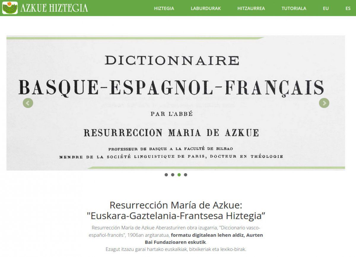 1905. urtean argitaratu zuen Resurrecion Maria Azkue Aberasturi hizkuntzalariak Euskara-Gaztelania-Frantsesa Hiztegia lan marduleko lehenengo liburukia, eta hurrengo urtean bigarrena. Urte luzez eginiko lanaren fruitua izan zen. Azkue inurriak bezala aritu baitzen dozenaka idazleren lanak aztertzen, eta, horrez gain, lekuko biziak elkarrizketatu zituen, tokian tokiko herri hizkerako hitzak jasotzeko. Azkuek ordenagailua ezagutu izan balu (1951. urtean hil zen), askoz errazago osatuko zuen hiztegia. Era berean, teknologia digitalak ahalmena du asko errazteko hiztegia arakatzea. Eta hori da, hain zuzen ere, Aurten Bai fundazioak egin berri duena. Sarean jarri dute lehenengo aldiz Euskara-Gaztelania-Frantsesa Hiztegia lanaren bertsio digitala.