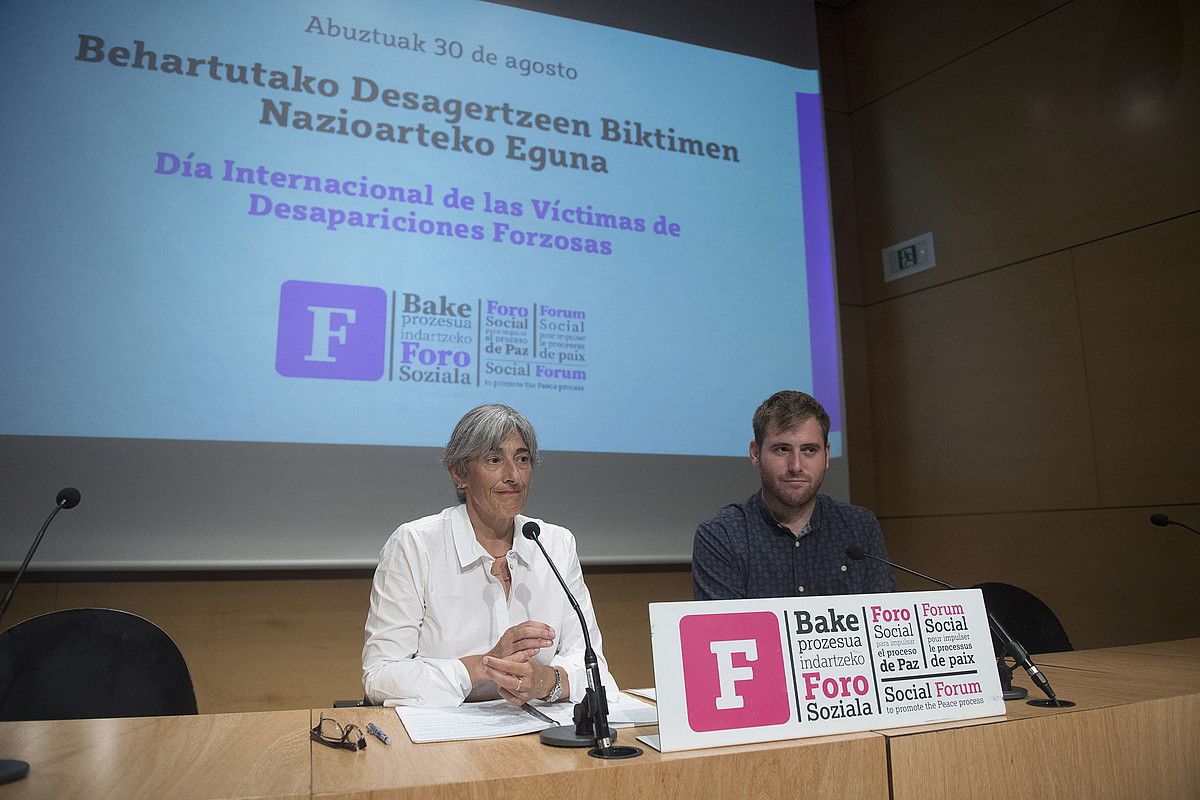 «Foro Sozialaren iritziz, euskal gatazka delakoaren testuinguruan behartuta desagerrarazi diren eta orain arte dokumentatuak dauden zazpi pertsonak non dauden jakiteko beharrezko diren tresnak eta mekanismoak martxan jarri behar dira». Hala adierazi zuten Nekane Altzelai eta Tasio Agirrezabalaga Foro Sozialeko kideek, atzo goizean Donostiako Koldo Mitxelenan egindako agerraldian. Haien hitzetan, behartutako desagertzea «beldurra barreiatzeko estrategia bat» da, eta, horrek sortzen duen «segurtasun faltaren sentsazioak» desagertutako pertsonaren senitarteko eta lagunengan eragina izateaz gainera, «komunitate osoari, gizarte osoari» eragiten dio.