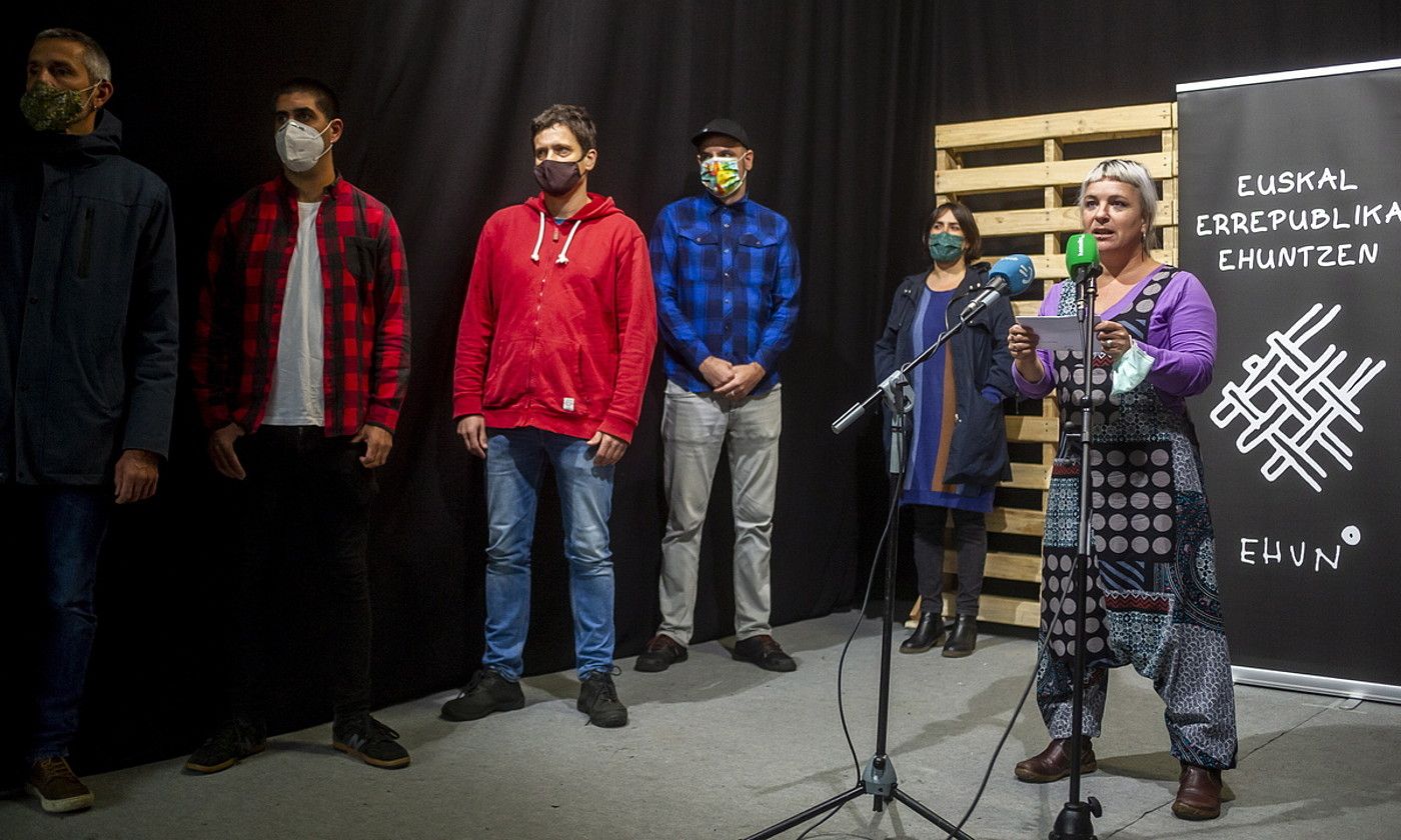 Ehun mugimenduko kideak, atzo, hilaren 22ko mobilizaziora deitzeko agerraldian. JAIZKI FONTANEDA / FOKU.
