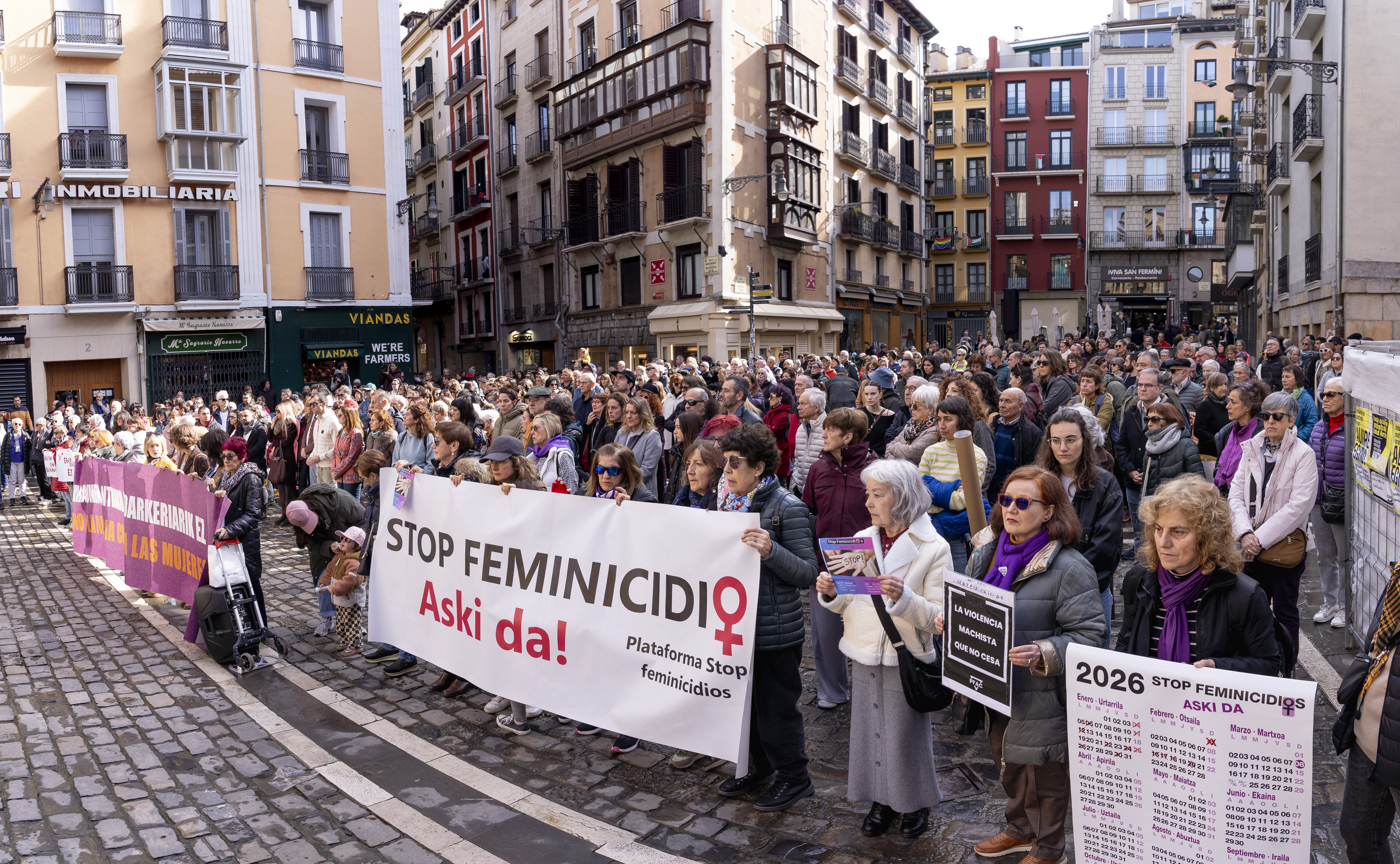 Atzo Sarrigurenen (Nafarroa), atzo eta gaur Iruñean eta bihar Hego Euskal Herriko gainontzeko hiriburuetan. Ostiralean Sarrigurenen izandako hilketa matxista arbuiatzeko protesta jendetsuak egiten ari dira; gaur Iruñean elkartu dira, udaletxe plazan, Euskal Herriko Emakumeen Mundu Martxak deituta. Nabarmendu dute ez dela gertaera isolatu bat: «Feminizidio bat da, gure kale eta etxeetan dirauen indarkeria zisheteropatriarkalaren adierazpen gordinena».