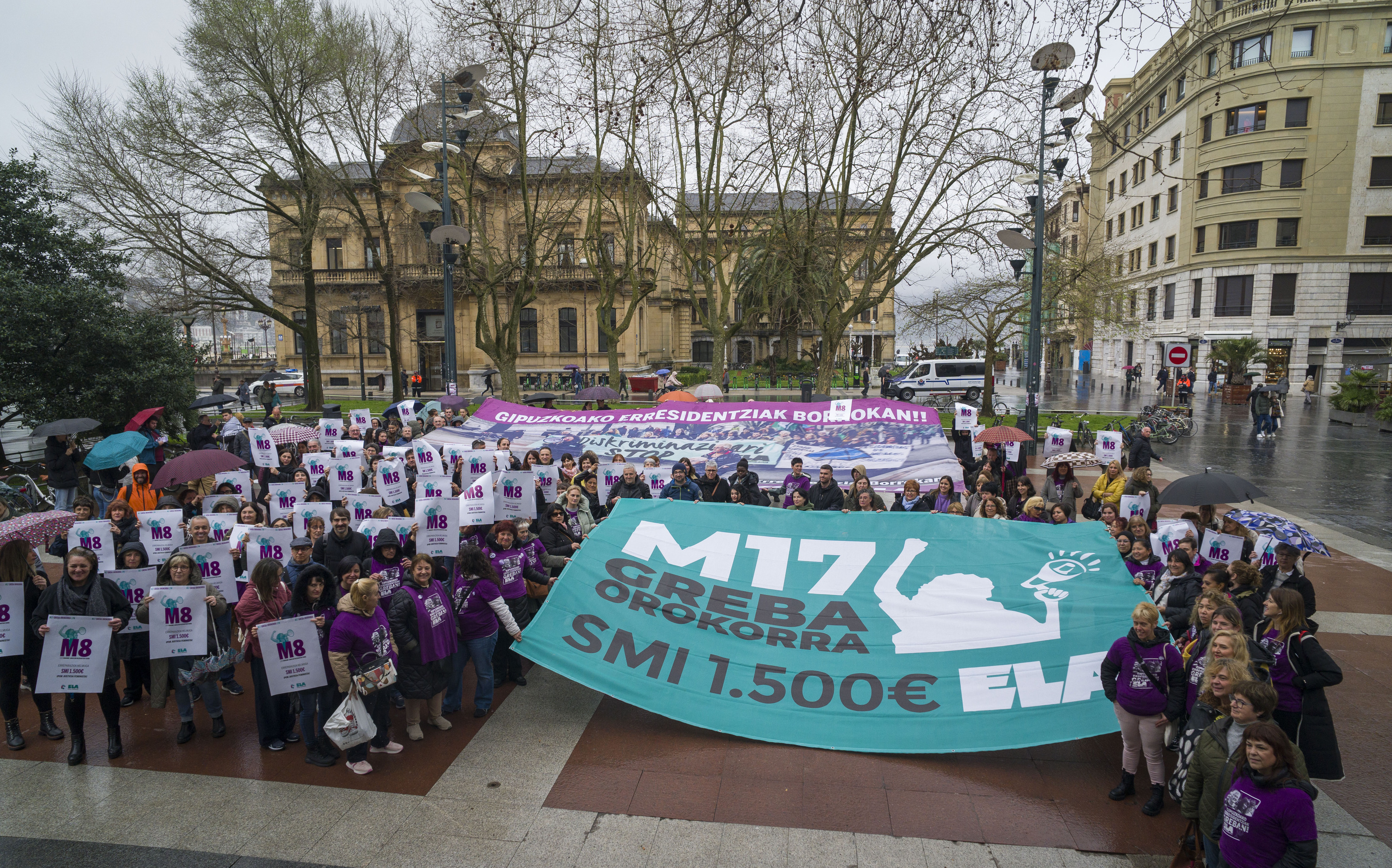 Hain zuzen, ELA, LAB, Steilas, Hiru eta Etxalde sindikatuek deitu dute greba orokorrera martxoaren 17rako, Hego Euskal Herrian gutxieneko soldata 1.500 eurora igotzea eskatzeko. Gaur ehunka lagun bildu dira Donostiako Bulebarrean, eta Jone Bengoetxea sindikatuko genero arduradunak adierazi du gutxieneko soldata igotzeak eragin handiagoa izango lukeela «lan eta sektore feminizatu eta prekarizatuetan»: «Gaur egun pentsio negargarria jasotzen duten emakumeei lagunduko die gutxieneko soldata igoerak, kontratu partzialak egiten baitizkiete bata bestearen atzetik». Gehitu du 65 urtetik gorako emakumeen artean pobrezia tasa handiagoa dela adin bereko gizonen artean baino.