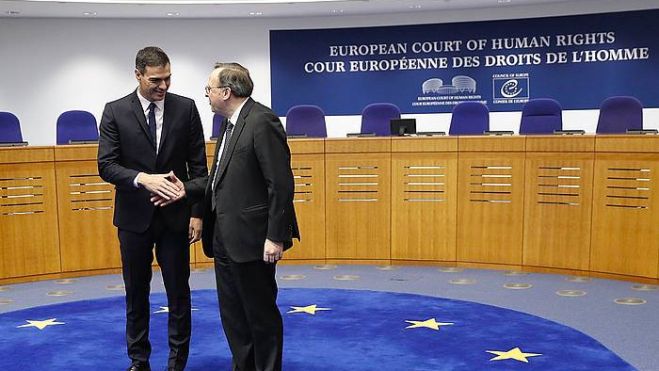 Pedro Sanchez Espainiako presidentea eta Estrasburgoko auzitegiko presidente Guido Raimondi, otsailean. J.P.GANDUL / EFE