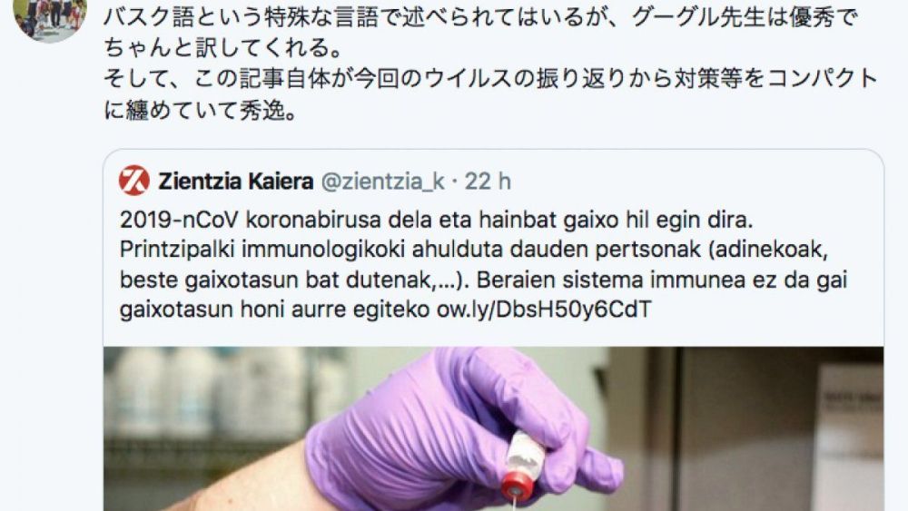 «Euskara, jalgi hadi mundura! Sarean denetarik dago, ona eta txarra, baita honako gauza pozgarriak ere», idatzi du Uxune Martinezek @UxuneM Twitterren. Zientzia Kaiera dibulgazio guneko kolaboratzailea da, eta koronabirusari buruz euskaraz idatzitako artikulu bat Japonian goraipatu dutela azaldu du. Miren Basaras mikrobiologoak idatzitako artikulua «bikaina» dela esan du Arisu Satoshi @arisu_satoshi Twitterreko erabiltzaileak, sareak euskaratik japonierara itzultzeko duen tresna bat erabili ondoren.