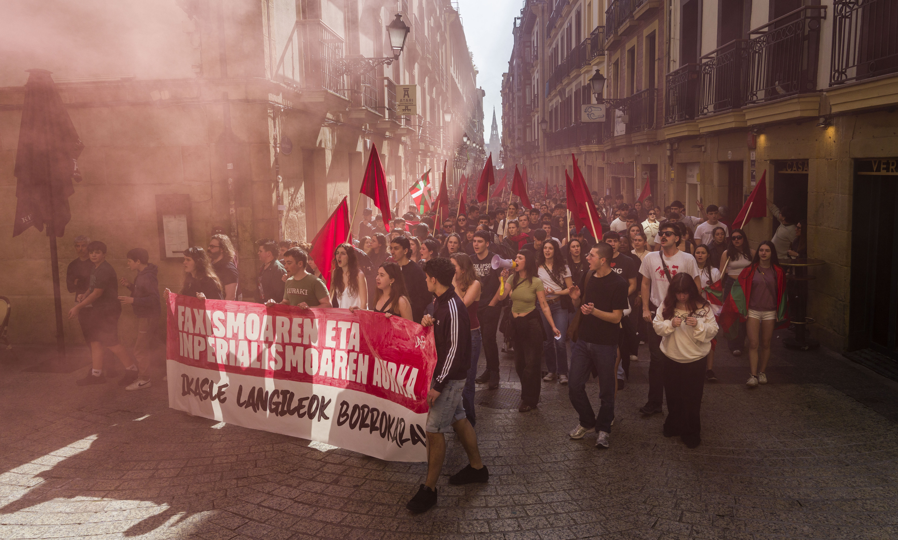 Petardoen danbadak eta ke poteak etengabeak izan dira ibilbidean. Ez polizienak, antolatzaileenak baizik. Parte Zaharreko kale estuetan barrena ibili dira, eta geldialdiren bat ere egin dute mobilizazioaren argazki txukunak atera ahal izateko. Turistak, harrituta. Batzuk galdezka, ea aurrera zetorren jende eta banderola gorri saldoak zer eskatzen zuen. Beste batzuek ez dute azalpenik eta itzultzailerik behar izan pankarta nagusiko faxismoaren eta inperialismoaren hitzak ulertzeko.