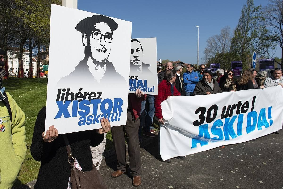 Frederic Haranburu, Jakes Esnal eta Ion eta Unai Parot askatzeko 2019 udaberrian Baionan egin zuten mobilizazio bat. GUIILAUME FAUVEAU