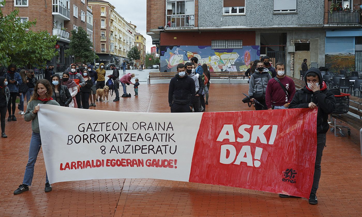 Maiatzaren 7an manifestazioak egin zituen Ernaik Bilbon, Gasteizen, Donostian eta Iruñean Gazteok larrialdi egoeran gaude lelopean. Bilbon istiluak piztu ziren gazteen eta Poliziaren artean, eta zortzi gazte atxilotu zituen Ertzaintzak. Joan den astean auzipetu zituzten atxilotutako zortzi gazteak, eta gaur goizean igaroko dira epailearen aitzinetik, Bilbon. Auzipetutakoei babesa adierazteko, dozenaka gazte bildu ziren atzo Gasteizen, Durangon eta Portugaleten egindako kontzentrazioetan. Irudian, atzoko Gasteizko mobilizazioa.