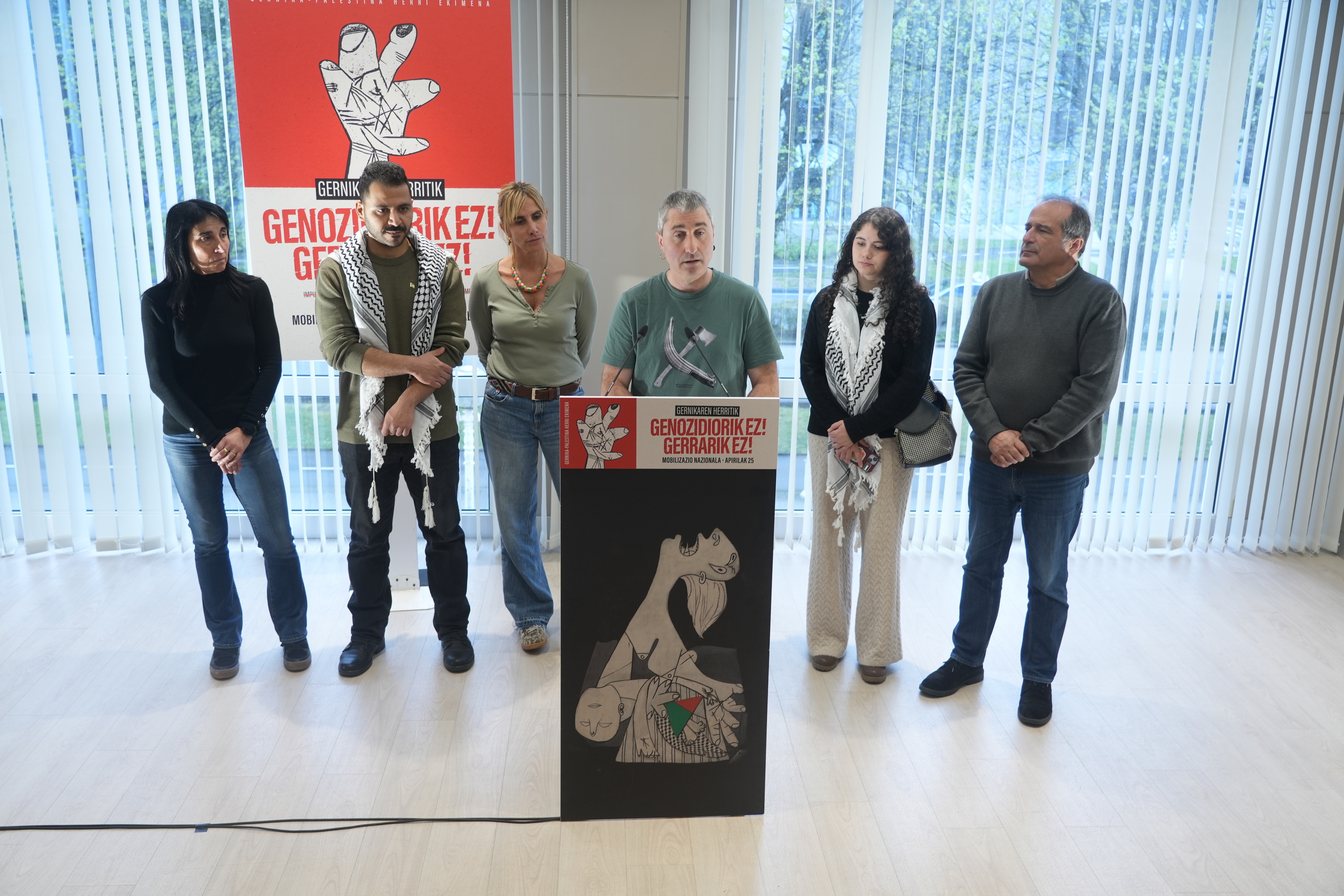 Gernikaren herritik, genozidiorik ez, gerrarik ez! lelopean, manifestazio nazional baterako deia egin du Gernika-Palestinak: apirilaren 25ean izango da, Donostian. Antolatzaileek gaur eman dute mobilizazioaren berri, prentsaurreko baten bidez; Naroa Iturrik eta Ibon Meñikak hartu dute hitza, eta salatu dute egoera «jasanezina» dela bai Palestinan, bai nazioartean.