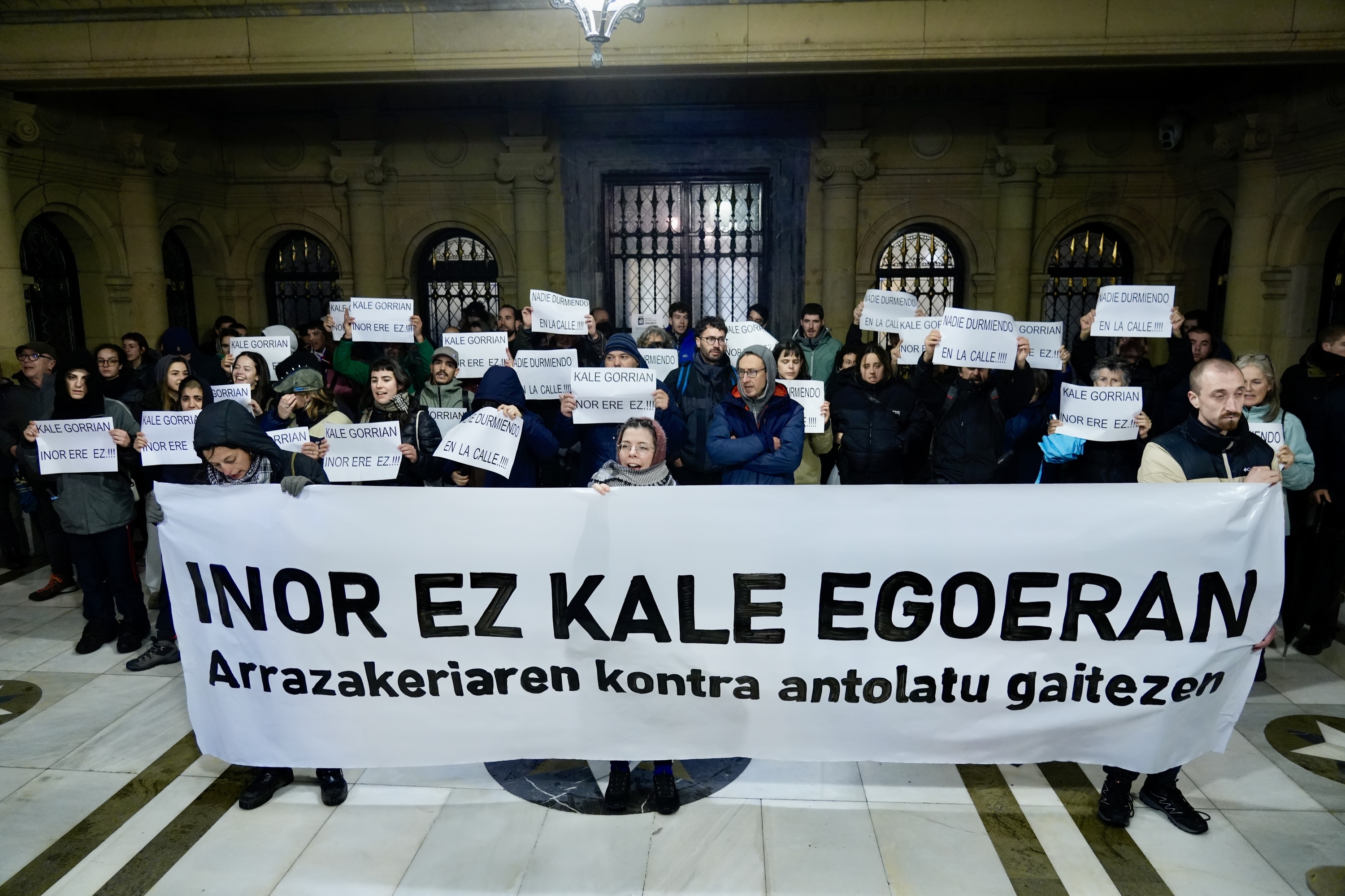 Hiriburuan etxegabeek duten egoeraz ere mintzatu dira. Kontzentrazioa egin duten eragileen erranetan, gutxienez 500 pertsona bizi dira kalean, eta Herrerako pabiloiak dira haiek duten «ia estalpe bakarra». «Udalak eremu publikotik botatzen ditu etxegabeak sistematikoki, eta fokua segurtasunaren auzian ezkutatu», erran dute. Joan den urte hondarrean kalean bizi ziren bi pertsona hil zirela ere gogoratu dute, eta udalak «errealitatea ezkutatzen» duela salatu.