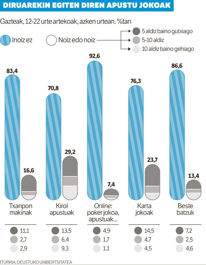 Apustua da gazteen «droga» berria. Hirutik batek jokatu du noizbait dirua, hamarretik batek hamar aldiz baino gehiago azken urtean, eta hogeitik batek izan dezake «arazo larriren bat» praktika horrekin, «garatu dezake jokoarekiko adikzioa». Hori ondorioztatu dute Deustuko Unibertsitateko Droga Mendekotasun Institutuko ikertzaileek, 12 eta 22 urte arteko gazteen ohiturei buruz egin duten inkestan.