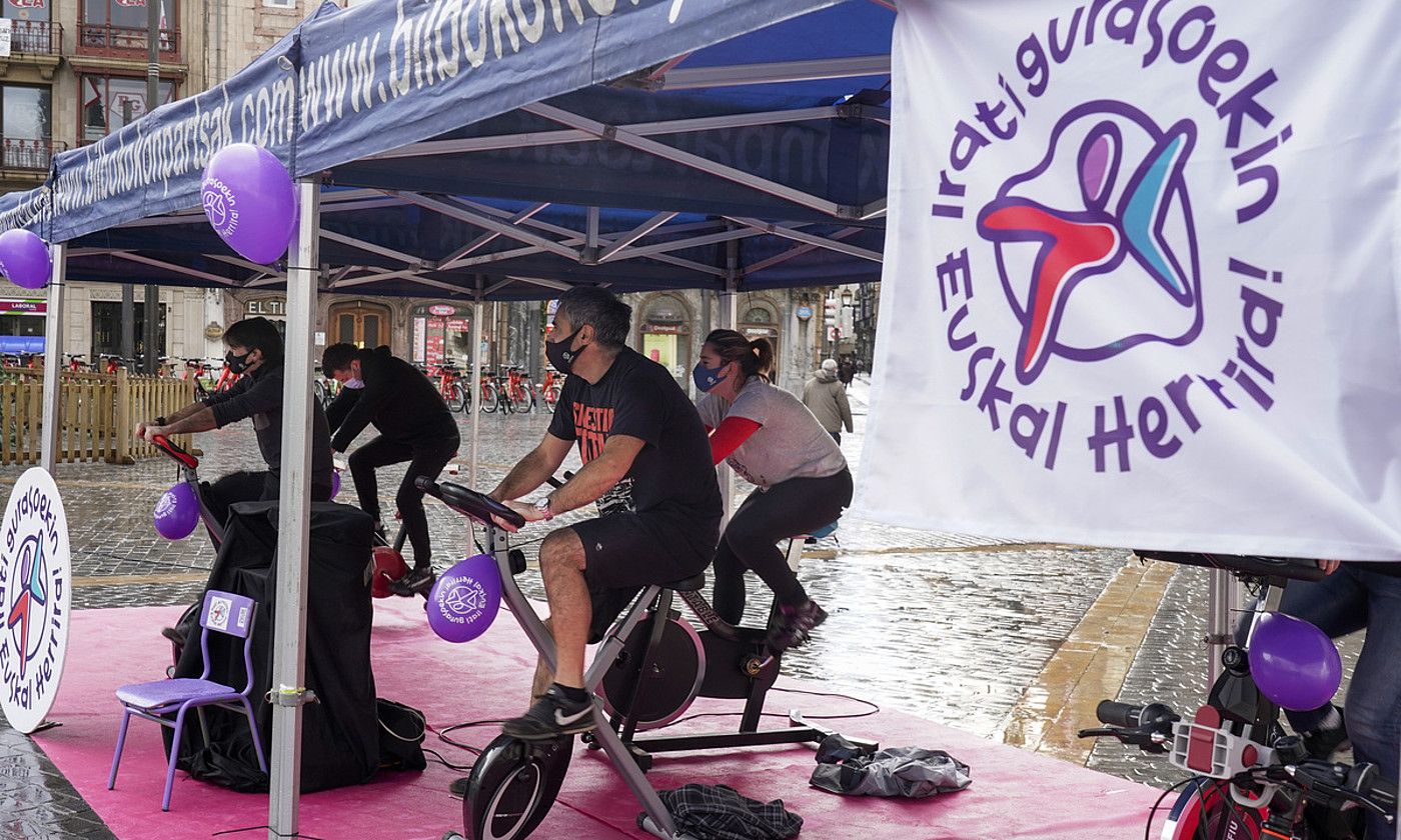 Euskal Herritik 450 kilometrora dago Aranjuez, eta tarte hori bizikletaz osatzea zen xedea. Arriaga plazan bost bizikleta estatiko jarri zituzten olana baten azpian, eta umeentzako seigarren bat ere bai. Sei orduz, 11:00etatik 17:00etara, Irati eta bere gurasoak Euskal Herrira ekartzeko eskaerarekin bat egiten zuten herritarrek pedalei eragin zieten, eta zenbagailu batek ordura arte egindako kilometroak adierazten zituen. Ekitaldia amaitu zutenerako aise gainditua zuten aldez aurretik ezarritako helburua.