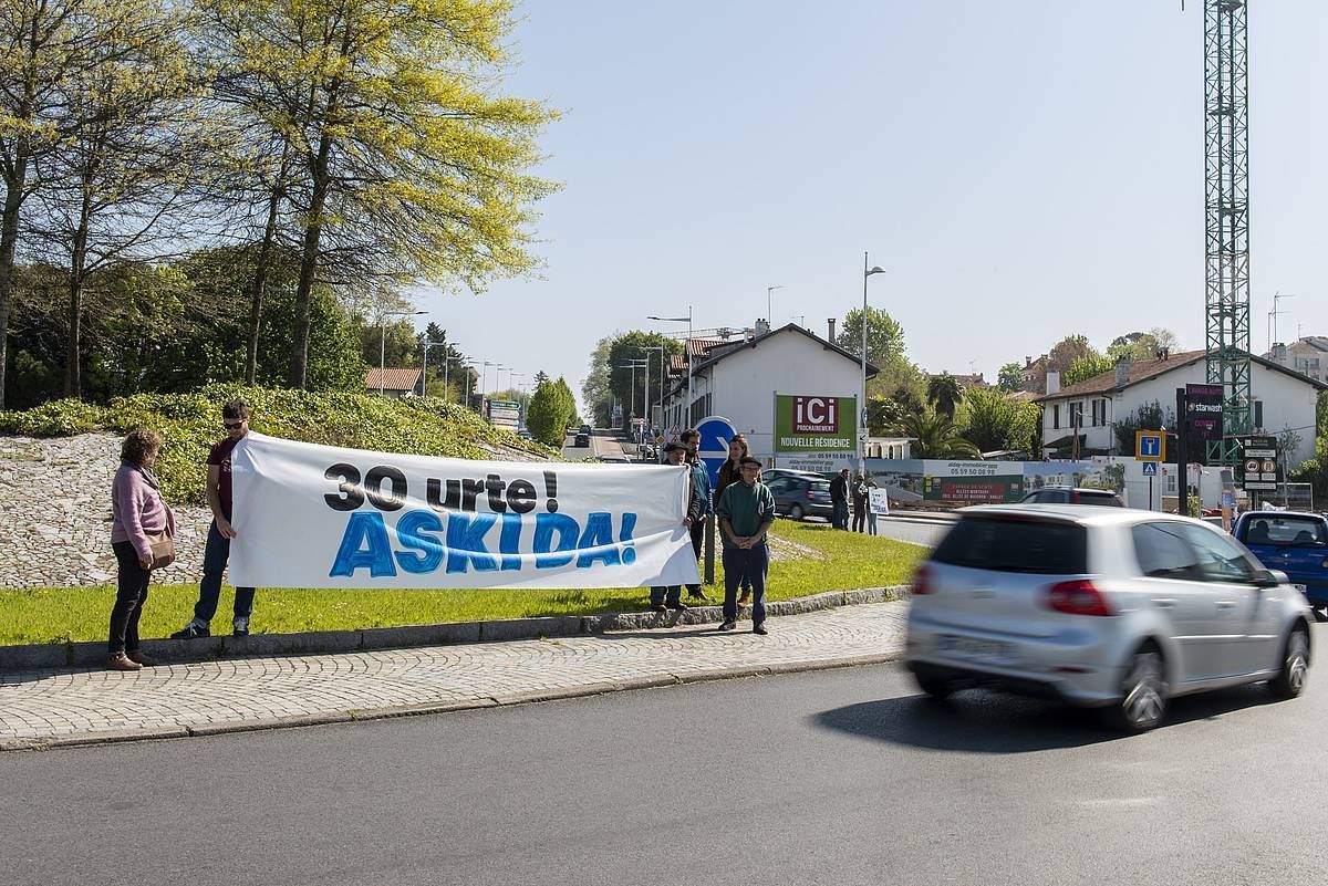 Jakes Esnal, Xistor Aranburu eta Ion eta Unai Parot aska ditzaten eskatzeko mobilizazio bat, Angelun, iazko apirilean. GUILLAUME FAUVEAU