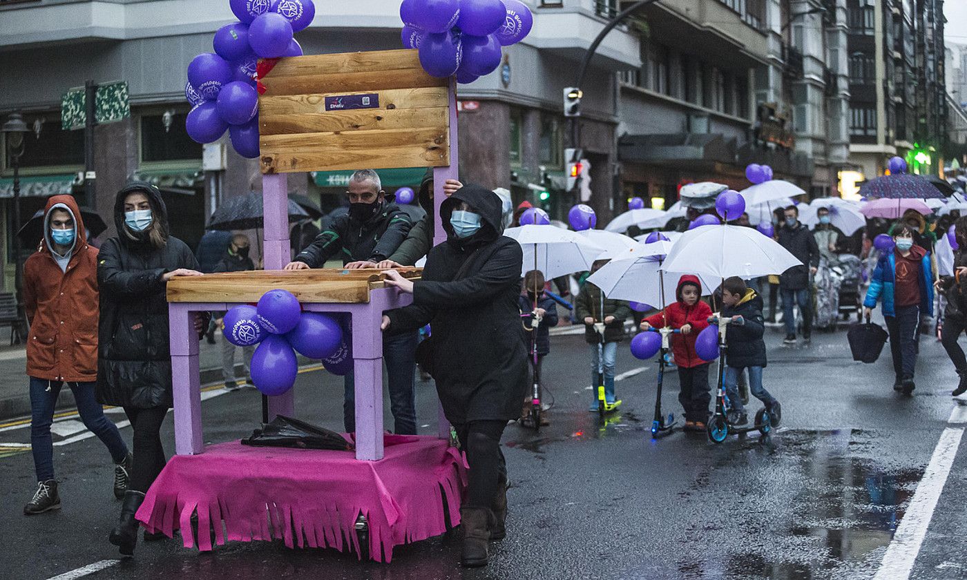 Enara pailazoak hartu zuen hitza aurrena. «Ume motxiladun bat naiz», adierazi zuen. «Leku gris batean jaio nintzen, eta 3 urte bete nituenean, esan zidaten: 'Kanpora!'». Egoera aurkeztu ondoren, kalejira gidatu zuen kamioira igo zen. Konfeti eta suziri eztandekin eta euri jasa hotsarekin batera abiatu zen segizioa, eta, bozgorailutik entzun ziren abestiak gorabehera, guztien tartetik izan zuen abagunea Enarak «aitatxo eta amatxo etxean nahi» zituztela hainbatetan gogorarazteko. «Nekatuta gaude hainbeste kilometro egiteaz».