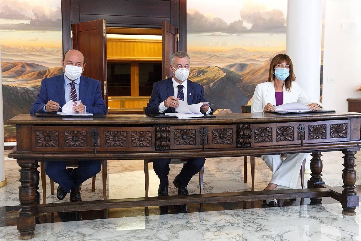 Ituna sinatu ostean agertu dira prentsa aretoan Ortuzar eta Mendia. Bi alderdietako buruzagi politikoek nabarmendu dute gehiengo osoa izan arren, oposizioari irekitako akordio bat sinatu dutena. EH Bildu, Elkarrekin Podemos eta PPri eskua luzatu diete akordioarekin bat egin dezaten, eta adostasunerako eskaintzatik at utzi dute Vox alderdiko legebiltzarkidea. «Egoerak eskatzen duen mailan» egoteko eta gobernuarekin «lankidetzan» aritzeko eskatu die Ortuzarrek oposizioko taldeei. «Ez da inposizioen garaia», erantsi du. Mendiaren esanetan, gehiengo osoa duen gobernu baterako akordioa da, baina aldi berean «eskua luzatuta» daukate gainerakoekin akordioak lortzeko.