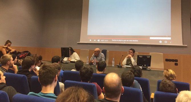 Jose Ramon Lopez de Abetxuko (mahaian, erdian), gaur, Gasteizen, EHUko hitzaldian. BERRIA