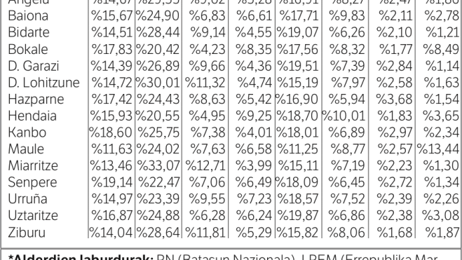 Europako Parlamenturako bozak zituzten atzo Ipar Euskal Herrian, eta Frantziako estatuaren kasuan ez bezala, sozialistak izan ziren nagusi horietan. Hamabost herri hartu ditu BERRIAk erreferentzia gisa, 5.000 biztanletik gorakoak Maule eta Donibane Garazi ez beste guztiak, eta denetan izan da lehen indarra Emmanuel Macronen taldea.