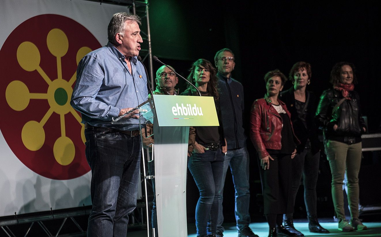 Joseba Asiron jarduneko alkatea Zentral antzokian, EH Bilduko koaliziokideekin batera. JAGOBA MANTEROLA / FOKU.