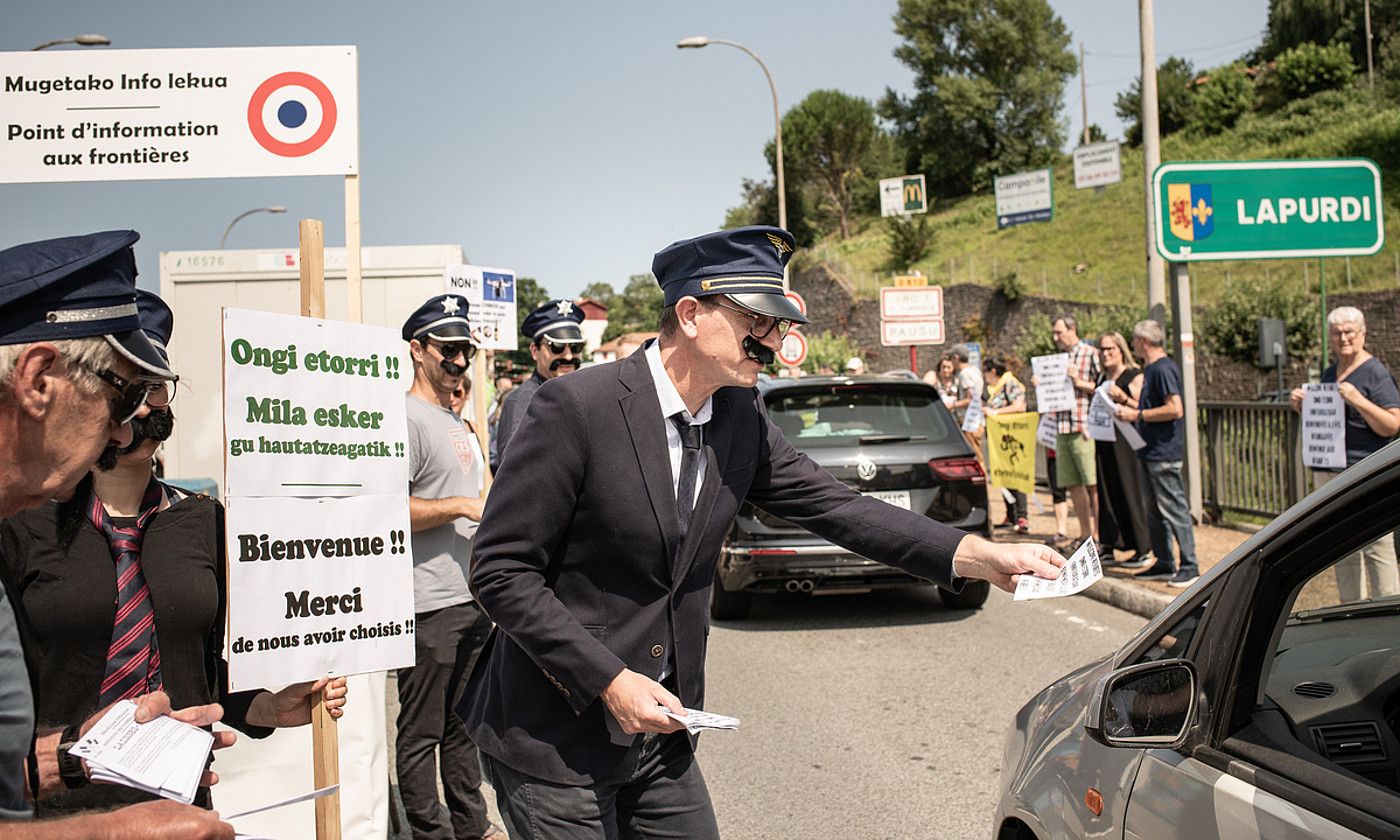 URRUÑA. Migratzaileen eskubideen aldeko ekintza bat egin zuten atzo Urruña (Lapurdi) eta Irun (Gipuzkoa) arteko zubian. Mugetako info gunea deiturikoa muntatu zuten Frantziako Poliziak kontrolgunea ezarri ohi duen lekuan, eta poliziaz jantzita, migratzaileen kontrako jazarpena salatu. Hainbat afixa banatu zizkieten handik autoz igaro zirenei, eta beste horrenbeste itsatsi zituzten Poliziaren etxolan. Inor ez da ilegala eta Ongi etorri errefuxiatuak mezuak zituzten.
