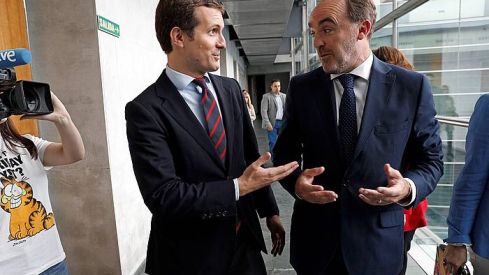 Pablo Casado PPko presidentea eta Javier Esparza Navarra Sumako presidentegaia, gaur, Nafarroako Parlamentuan. VILLAR LOPEZ, EFE