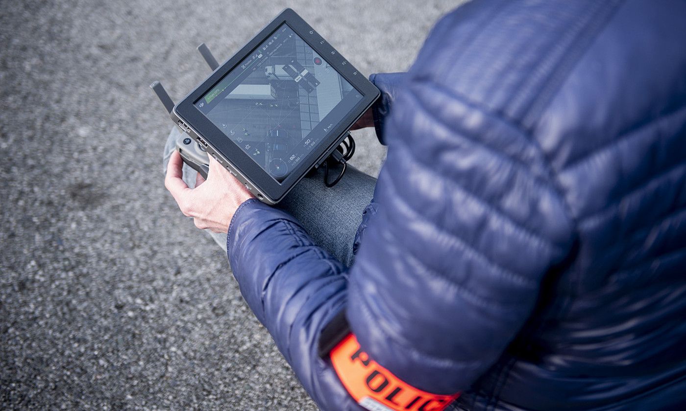Frantziako polizia bat, drone bat gidatzen. GILLAUME FAUVEAU.