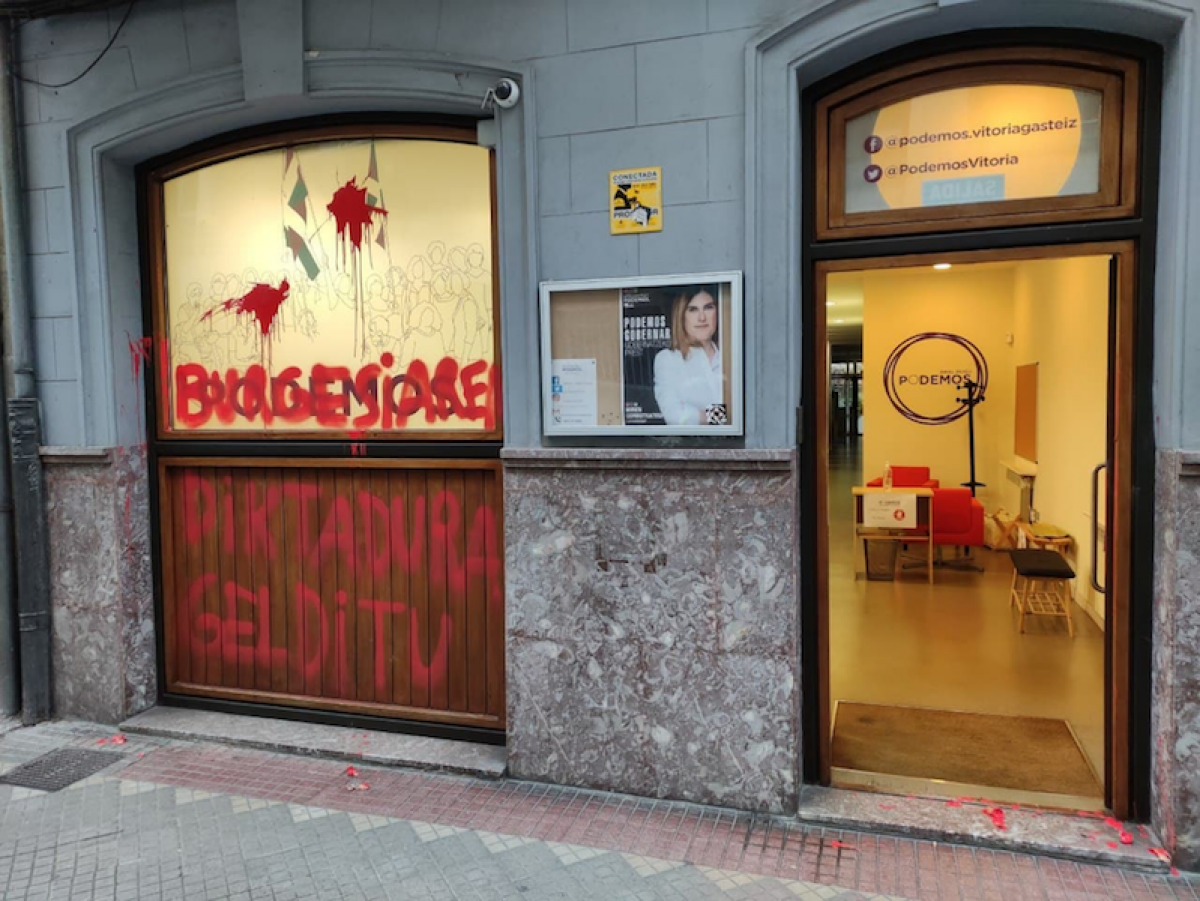 Pintaketak egin dituzte gaur Ahal Dugu-ren eta PSEren Gasteizko egoitzetan.  Burgesiaren diktadura gelditu leloa idatzi dute Ahal Dugu-ren egoitzaren atariko kristalean, eta pintura gorria bota dute bertara. PSEk Gasteizko Forondako Atea kalean duen egoitzaren atariari ere pintura gorria bota diote.
