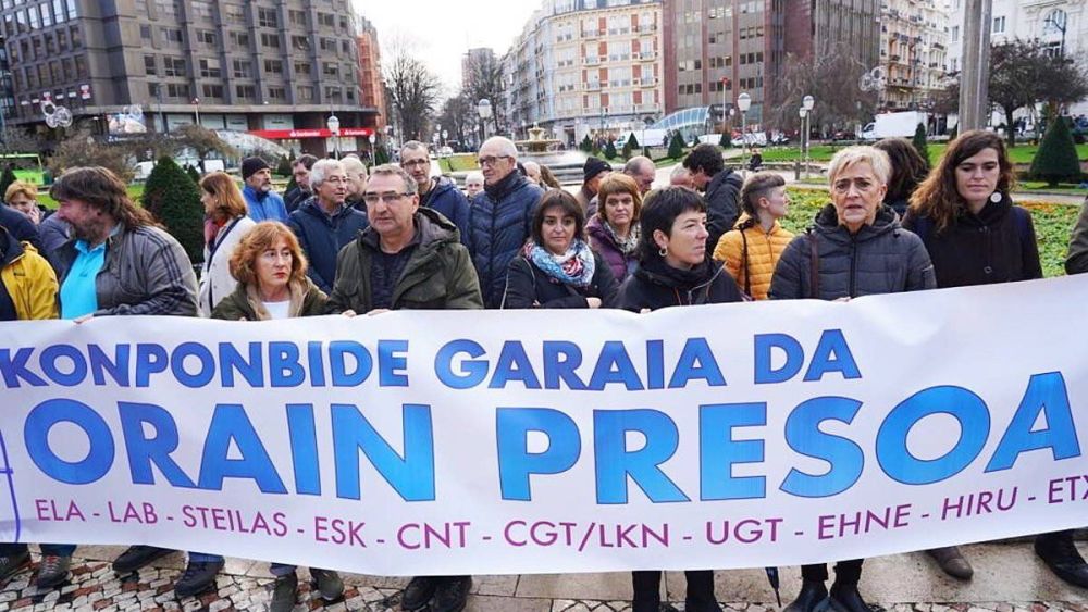 Hilero bezala, euskal sindikatuek –ELAk, LABek, UGTk, Steilasek, ESK-k, CNTk, CGTk, EHNEk, Hiruk eta Etxaldek– elkarretaratzea egin dute Espainiako Gobernuak Bilbon duen ordezkaritzaren aurrean, Konponbide garaia da. Orain presoak lelodun pankarta baten atzean, Urtebete daramate hileroko agerraldi horiekin –2019ko urtarrilean hasi ziren–. Elkarretaratzean, LABeko ordezkari Cristina Alvarezek ontzat jo du Eusko Jaurlaritzako Bake eta Bizikidetza idazkari Jonan Fernandezek egindako proposamena, euskal presoak zazpi espetxetara hurbiltzekoa.