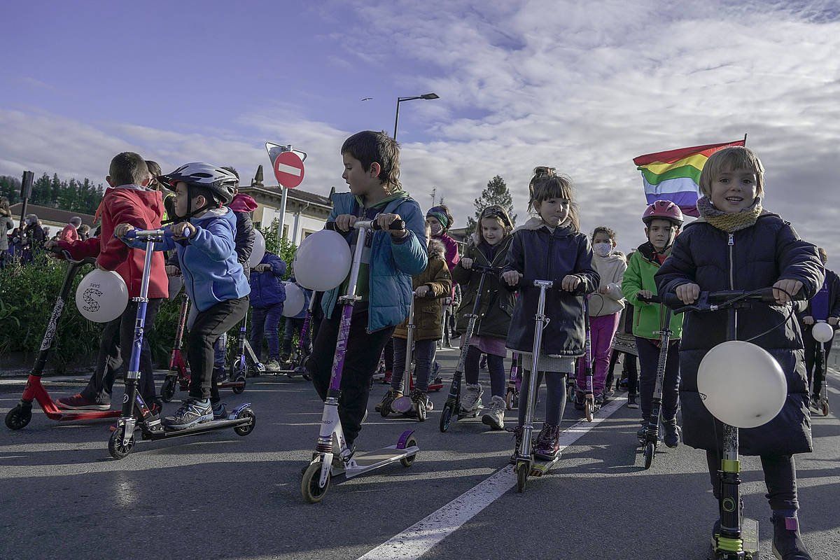Martuteneko espetxetik hasi, eta Loiolaraino (Donostia, Gipuzkoa) egin dute martxa hainbat lagunek goizean, ume motxiladunen egoera salatzeko. Sare Herritarrak deitu zuen kalejira egitera, «urrunketagatik eta osasun egoeragatik gurasoak kartzelan dituzten haurrak umezurtz» gelditu direla salatzeko. Patinetean joan nahi dut aita/ama ikustera leloa zuen pankarta eraman dute martxan zehar, eta umeek patinetez egin dute martxa. «Urte luzez, haur eta nerabe asko bidaia amaigabeak egitera behartuak izan dira beren aitari, amari edo biei muxu bat eman ahal izateko; aurten, ordea, bizi izan dugun pandemiaren eraginez, oztopo berri bat agertu da motxiladun umeen eta haien guraso presoen arteko harremanean», salatu dute.