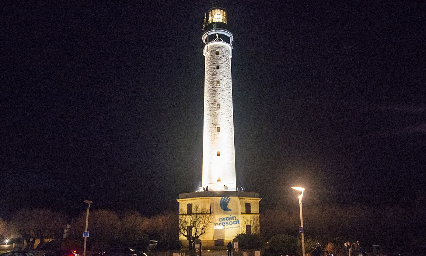 Pankarta bat eskegi dute Miarritzeko itsasargian, irudikatzeko «bakerako bidea argitu» nahi dutela. «Kartzelak husteko garaia» dela erran dute, eta, horretarako, beharrezkotzat jo dute mobilizazioa