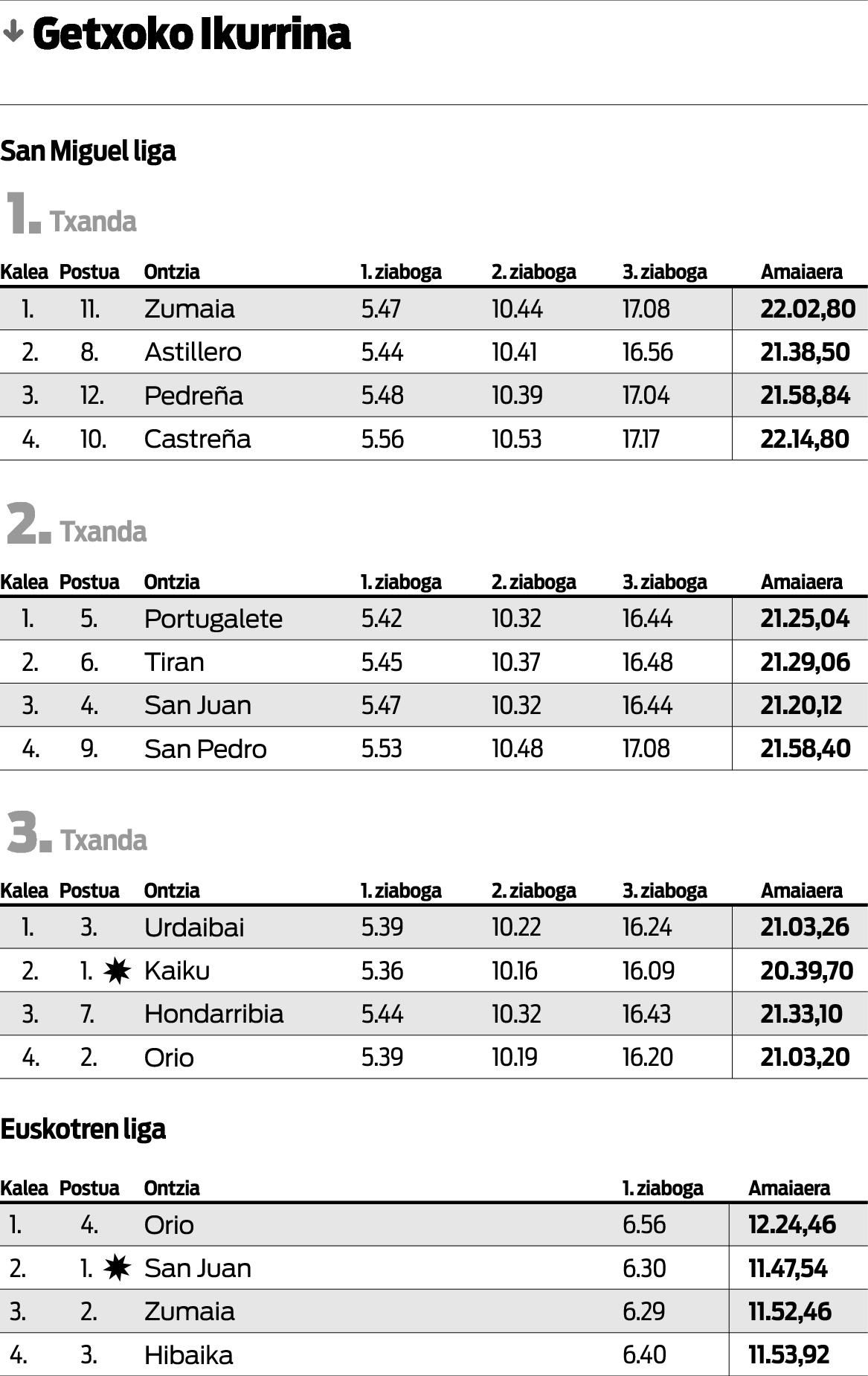 Ezustea izan zen Euskotren ligan. San Juanek lehen bandera irabazi zuen, Zumaia liderra lau segundoan menderatuz. Hibaika seira sartu zen. Gaur Zumaian dute lehia (12:00), ligako bosgarrena.