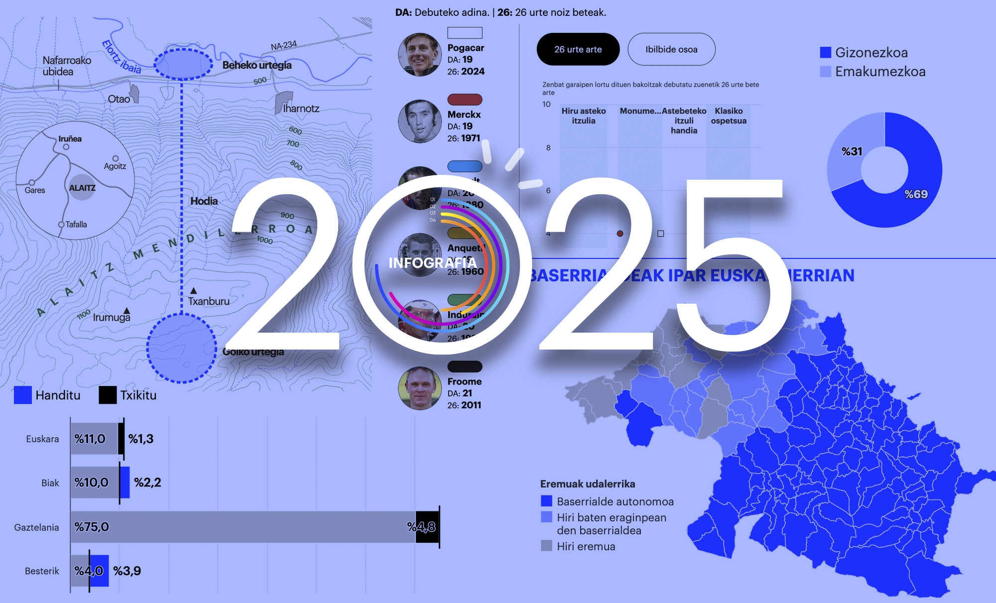 Esaten da matematikek mundua ulertzen lagundu dezaketela, eta hori izaten da datu kazetaritzaren erronka: gertakari bat esplikatzen laguntzea, datu sortak arakatuta. Irudi batek mila hitzek baino esplikazio hobea ematen duela ere esaten da, eta horixe izaten da infografisten lana: gertakari bat argiago azaltzea, grafikoak erabilita. BERRIAko taldeak ahalegin handia egiten du datu kazetaritzan eta infografismoan, eta azkeneko urteetan jauzi bat egin du datuak webean modu interaktiboan erakusteko. Ahalegin horren erakusleiho bat da artikulu hau, BERRIAk 2025ean egin duen lan infografikoaren laburpen bat, hamabi grafiko ikusgarri eta esanguratsutan oinarritua.