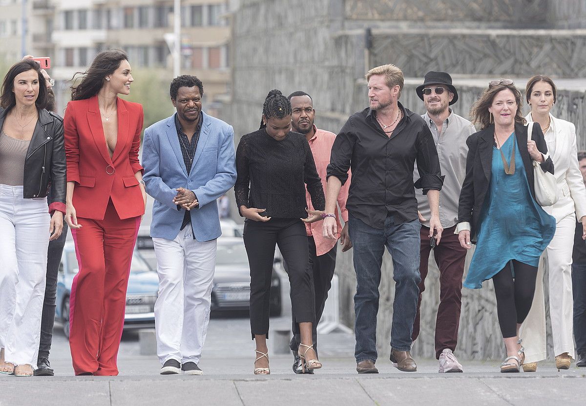 Paxton Winters zuzendaria (laugarrena eskuinetik), Pacificado filmeko aktore eta ekoizleekin —tartean Darren Aranofski—, atzo. ANDONI CANELLADA / FOKU.