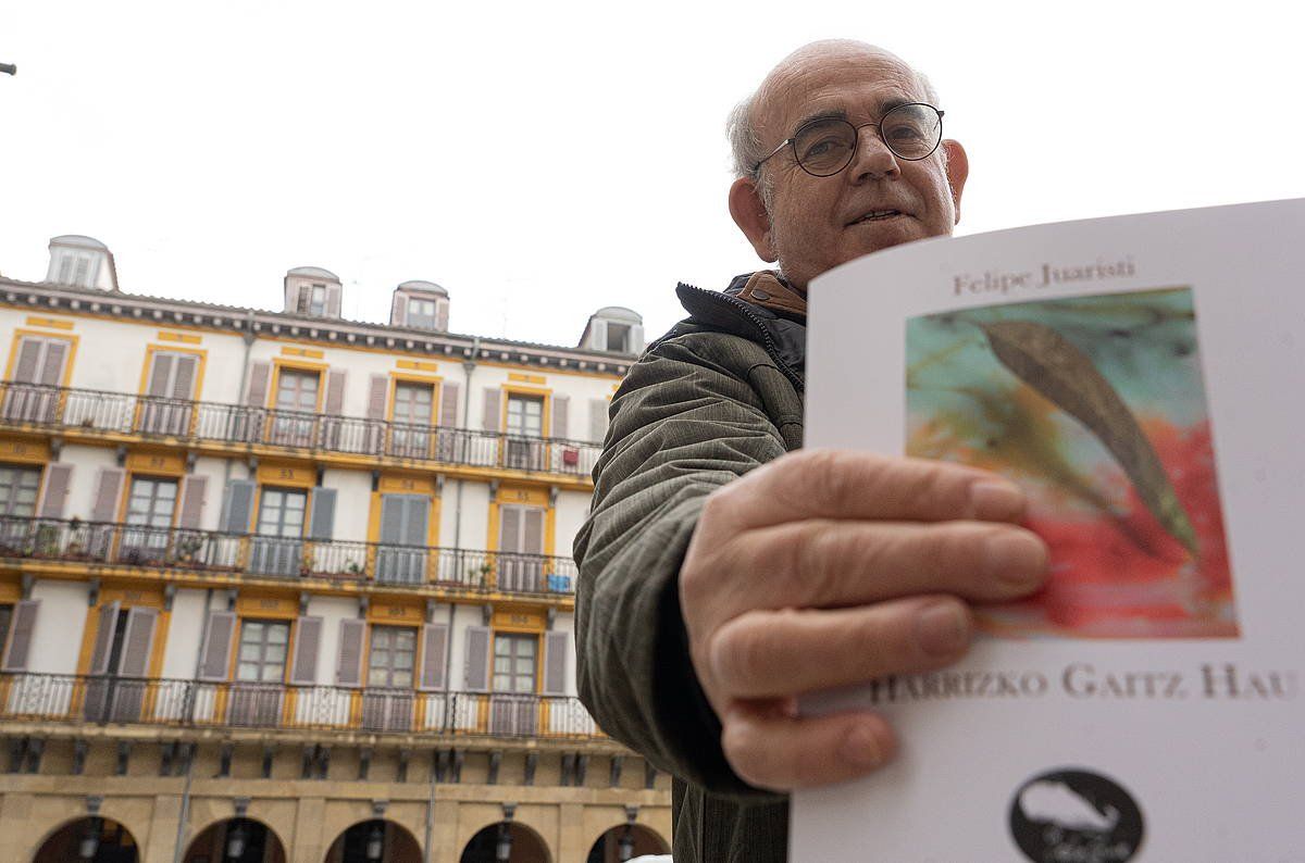 Felipe Juaristi idazlea, poema liburu berria esku artean duela, Donostian. JAGOBA MANTEROLA / FOKU