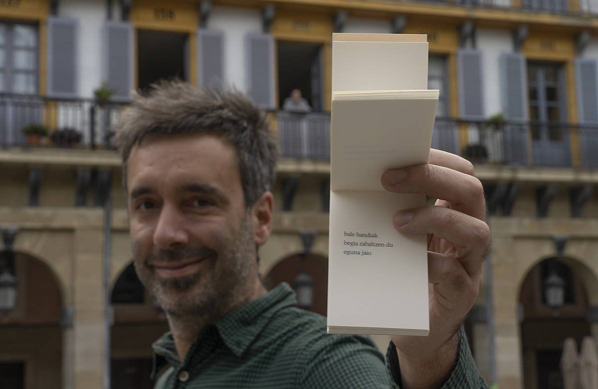 «Plak plak plak plak plak/ biguntzen da tantaka/ harri gogorra». Izenburua ere barnebiltzen duen haiku horrek abiatzen du Peru Magdalenaren (Berriz, Bizkaia, 1989) lan berria. Berria eta, batez ere, «berezia». Behin eta berriz agertu da berba aurkezpenean. Haikuak direlako, gutxi-asko eskuko telefono baten neurria duelako, eta gainean eramateko, orriak banan erauzteko, oparitzeko, desegiten joateko pentsatuta dagoelako liburua. Zehatz, 10 zentimetro luze eta 6,5 zentimetro zabal da liburua: «Txikia eta eramangarria da», berretsi du egileak. «Funtsean, artefaktu txiki bat egin nahi nuen, kutixi bat, opari bezala funtzionatuko lukeen keinu poetiko bat».