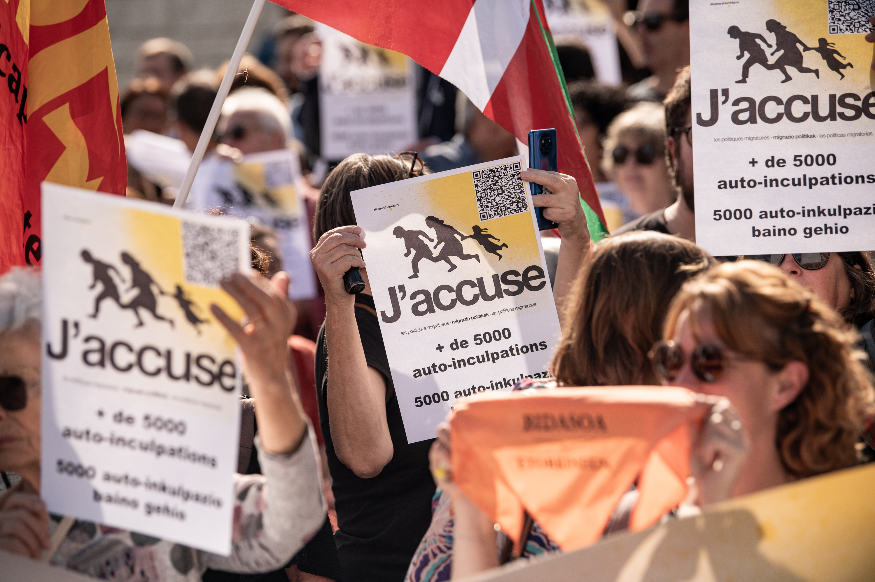 Hauek ziren auzipetuak: LAB sindikatuko Eñaut Aramendi eta Argitxu Dufau, EH Bai eta Etorkinekin kolektiboko Jakes Bortairu eta Dominika Dagerre, Bidasoa Etorkinekin elkarteko Aintzane Lasarte, eta Frantzia Intsumisoko Thomas Dubois. «Migrazio politika arrazista eta hiltzaileak» salatu zituzten auzi saioan, eta politika horiei emandako erantzun gisa aurkeztu 2024ko martxoko ekintza. Auzipetu zituztenez geroz, J'accuse (salatzen dut) autoinkulpazio kanpaina abiatu zuten. Urrian, 5.000 jende inguruk emana zuten izena.