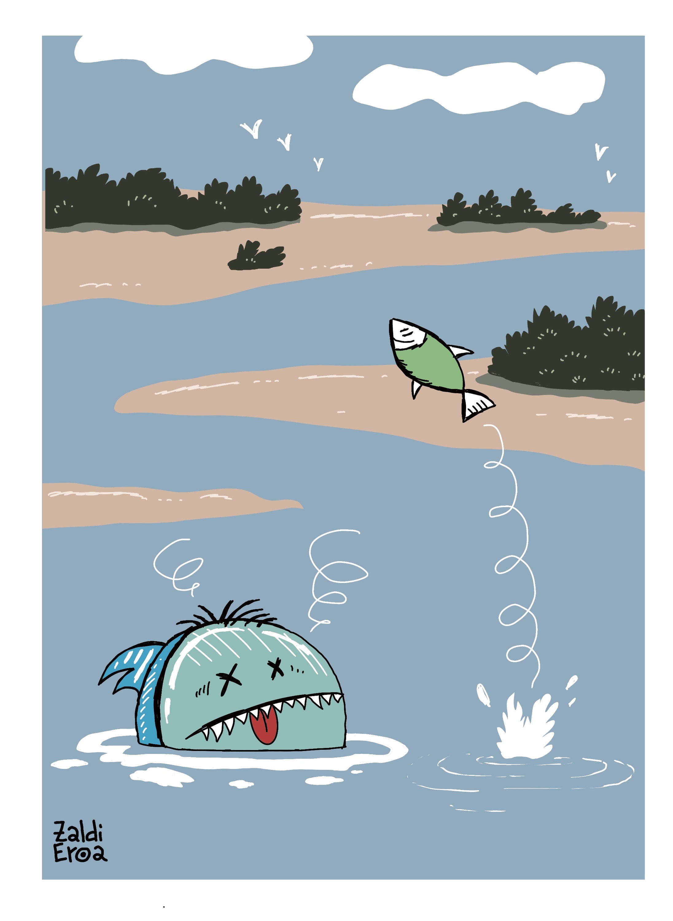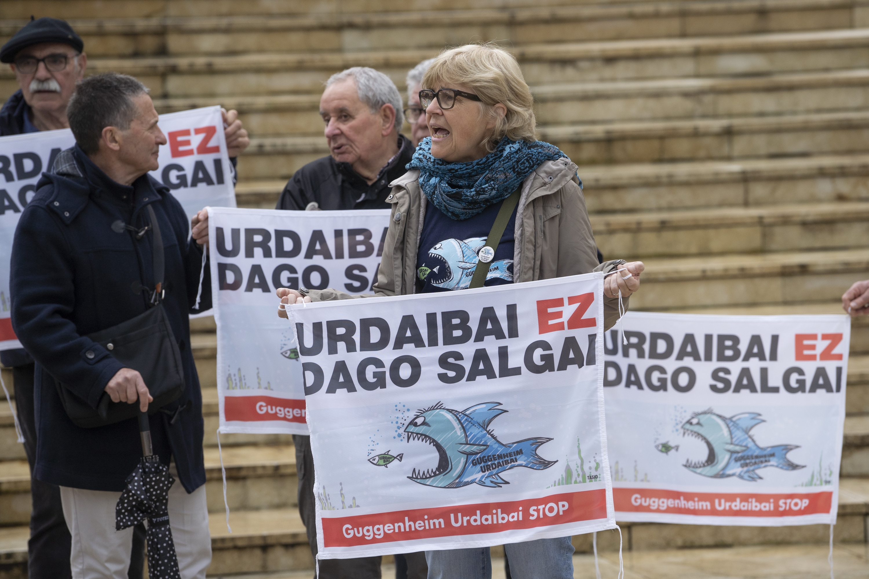 Arrain handi bat txikiago bat jaten. Horrela irudikatu zuten Urdaibain egin nahi zutena plataformako kideek. Irudi hori erabili zuten protestetarako, metafora gisa: Guggenheim arrain handia da, eta Urdaibai, berriz, txikia. «Urdaibai ez dago salgai», esaten zuten. Urte hauetan, herritarrek proiektua geldiarazteko zenbait ekintza antolatu dituzte: hitzaldiak, sinadura bilketak, manifestazioak, ibilbideak, material salmenta... Pertsona eta erakunde ugariren atxikimendua lortu dute. Iazko urrian, adibidez, protesta jendetsua egin zuten Gernika-Lumon.