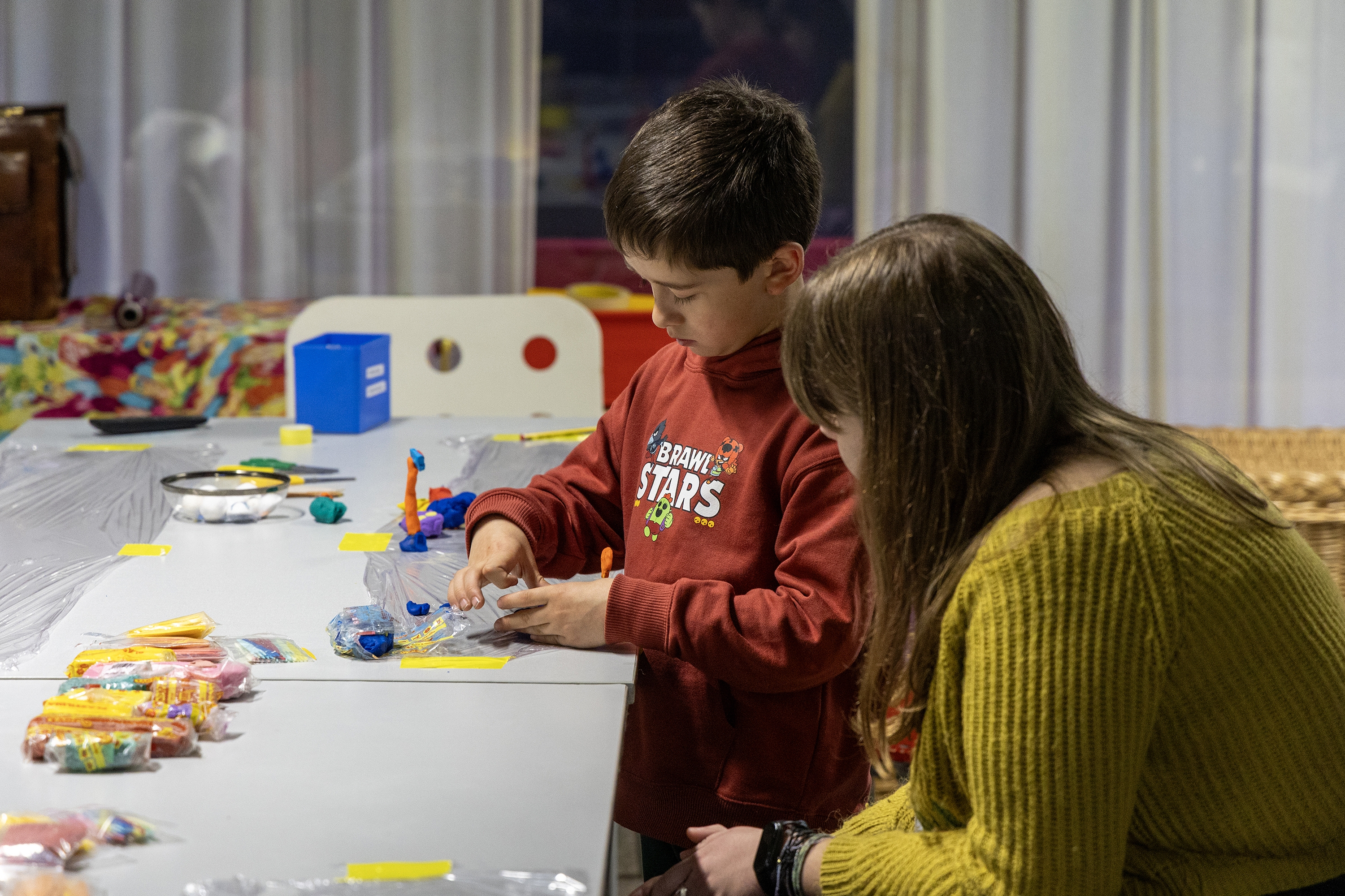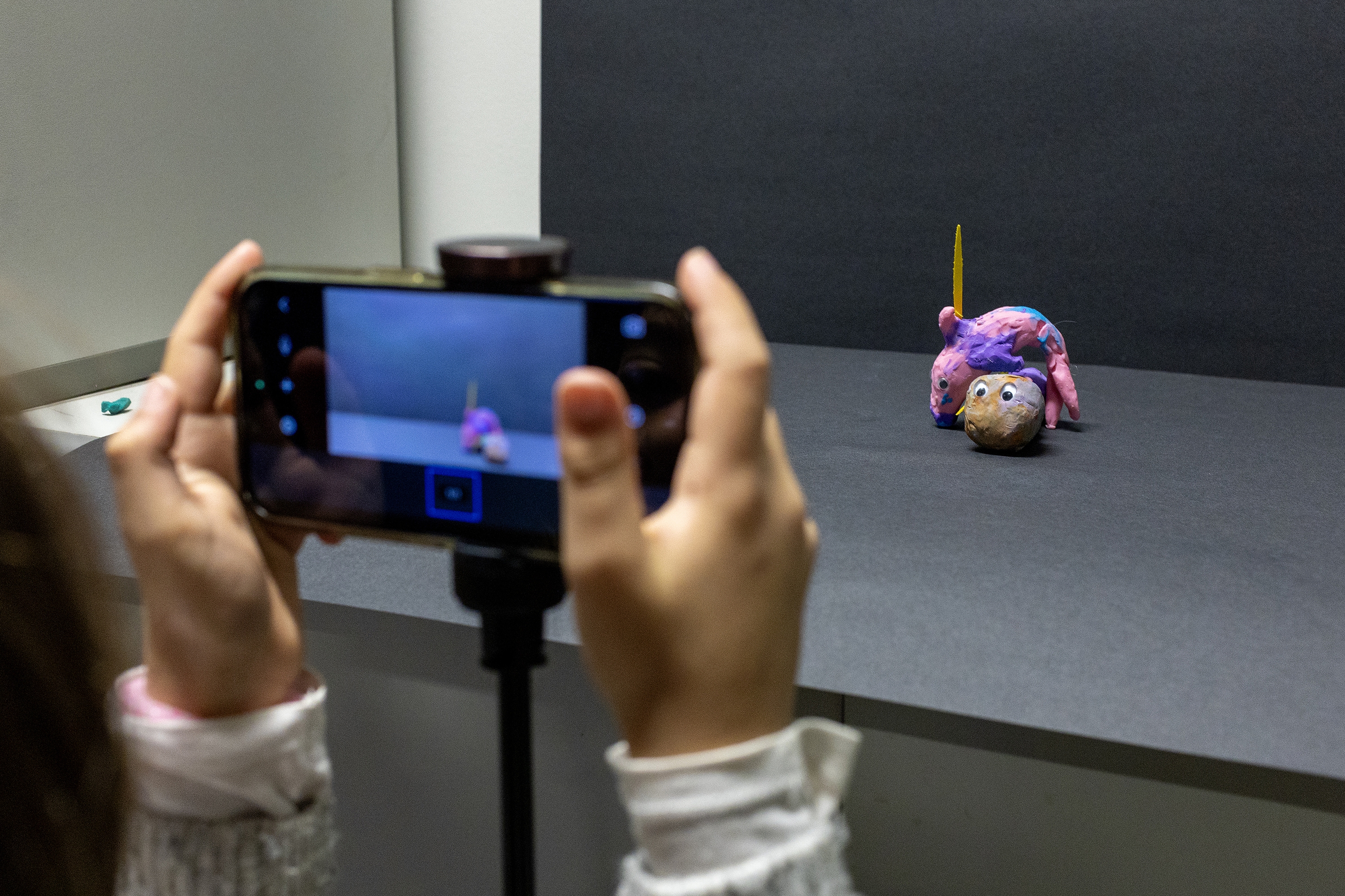 Eguneko tailerra bukatzeko, eszenografia sortzeko ariketa bat egin dute. Kartulina beltzez osatutako eszenatokian kokatu dituzte plastilinaz sortutako pertsonaiak, eta bertan hasi dira istorioa pausoz pauso nola grabatuko duten irudikatzen, telefono bat erabilita. Ulertu dute nola funtzionatuko duen: «Film labur bat ekoitziko dugu, bai. Baina prozesua bera da garrantzitsuena, eta stop motion-a zer den ulertzea».
