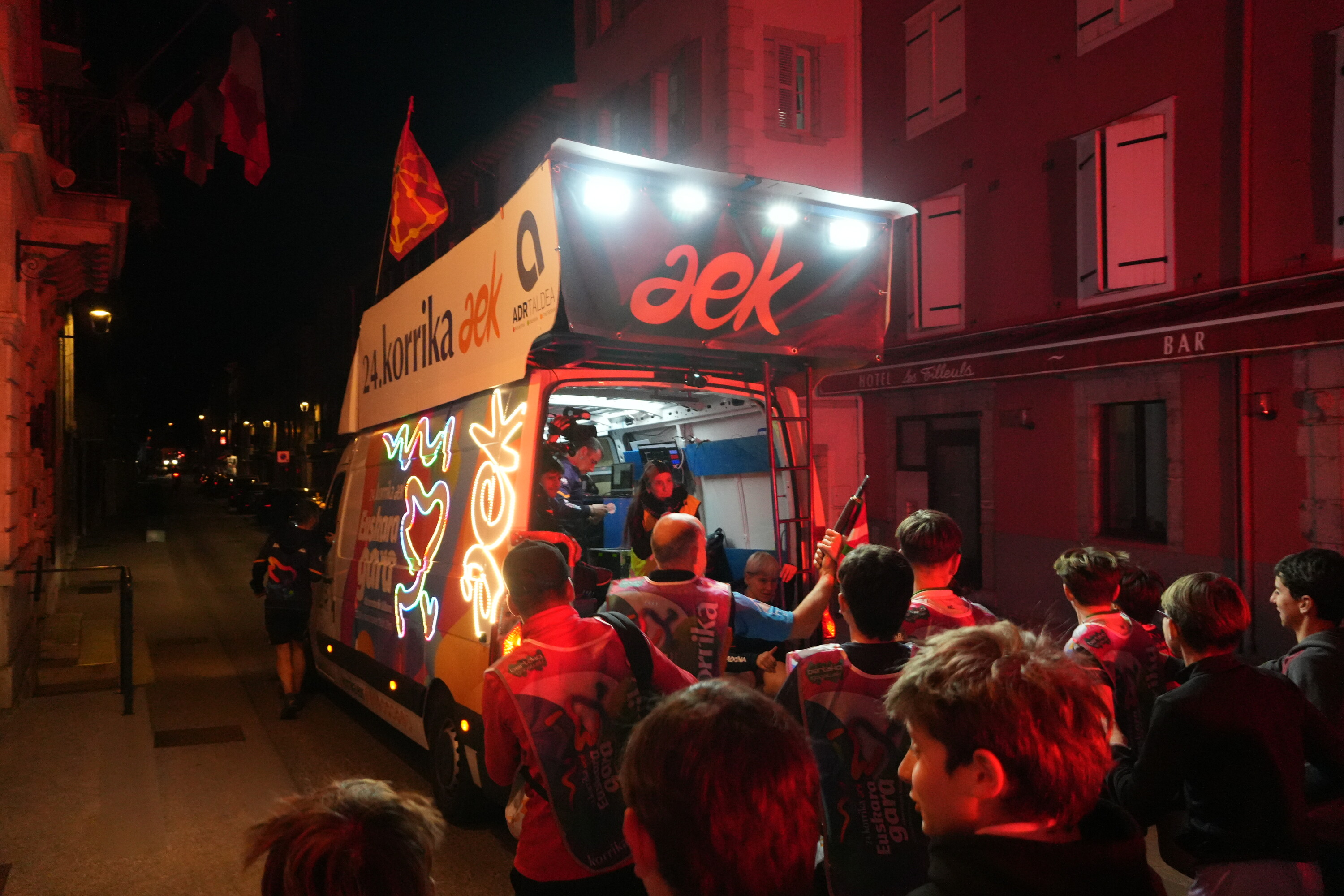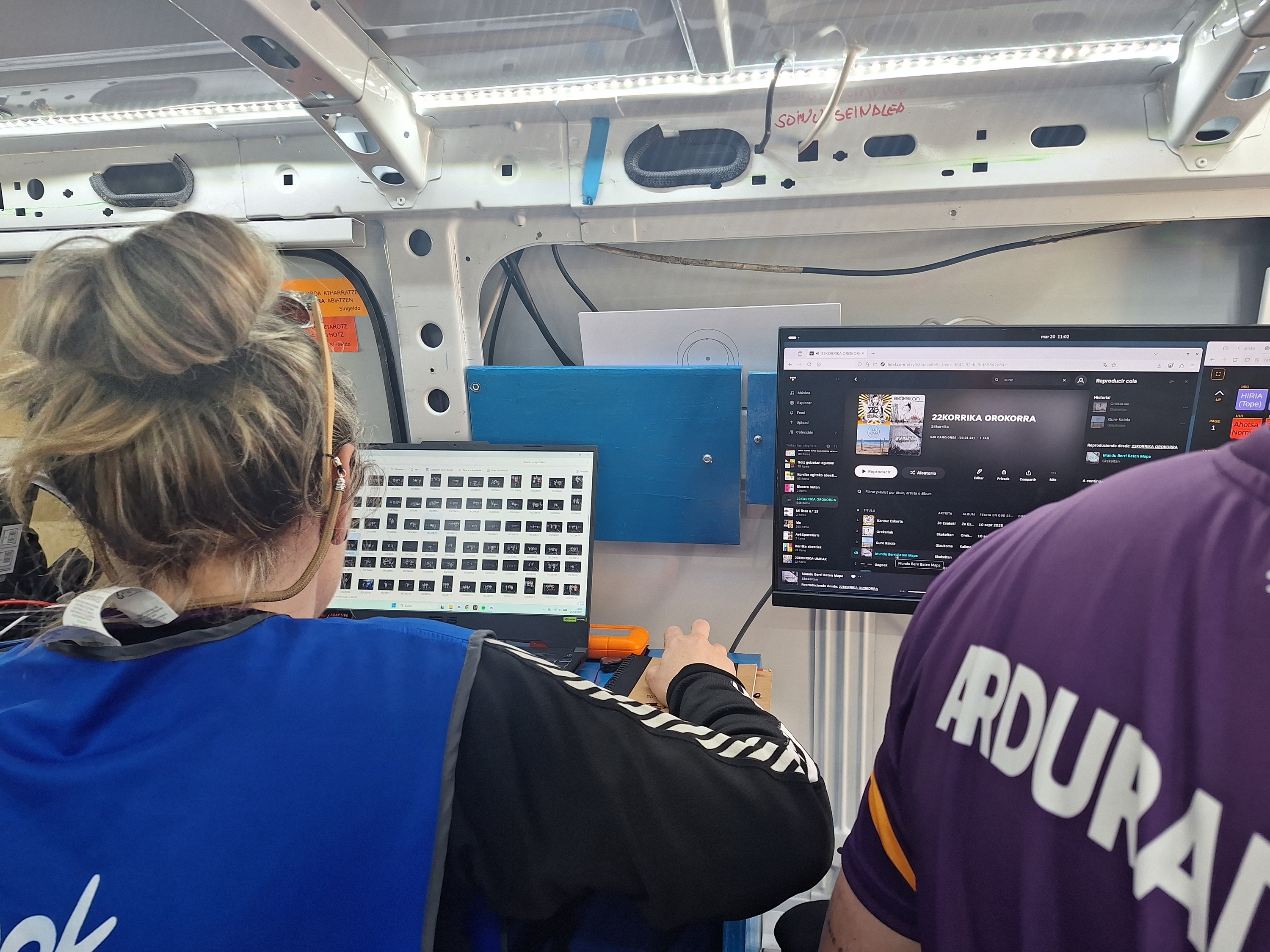 Atseden gutxi hartu dute orain arte, baina indartsu daude oraindik peto moredunak, euskararen aldeko lasterketako lehen gaua baita. Ondo atonduta daukate dena furgonetan: igotzeko eta jaisteko burdinazko bi helduleku daude, eta alde banatan, armairuak ere badiren eserlekuak: barruan gordetzen dituzte motxilak, ura eta janaria. Furgonetaren goiko ertzetan, berriz, musuzapiak eta entxufeak nonahi. Apal bat ere badago, motxilak gordetzeko hori ere, eta musika ekipoa du alboan, ordenagailuarekin batera. Pantailan, bi leihatila: musika jartzeko aplikazioa batetik, eta lasterketa denboraz ondo dabilen adierazten duen tresna, bestetik. «‘+4:55’ jartzen du, berdez; horrek esan nahi du bost minutuko atzerapena dugula; ondo goaz!».