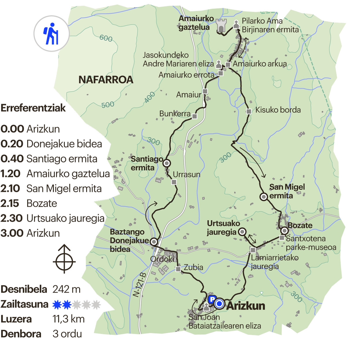 Ibilbide zirkular honek, Arizkun, Urrasun, Amaiur eta Bozate herri eta auzoak lotzeaz gain, haien historiaren lekuko garrantzitsuak izan diren tokiak ezagutzeko parada eskaintzen digu: Donejakue bidea, Amaiurko gaztelua eta errota, Bozateko agotak eta Urtsuako dorretxe-jauregia, besteak beste.
