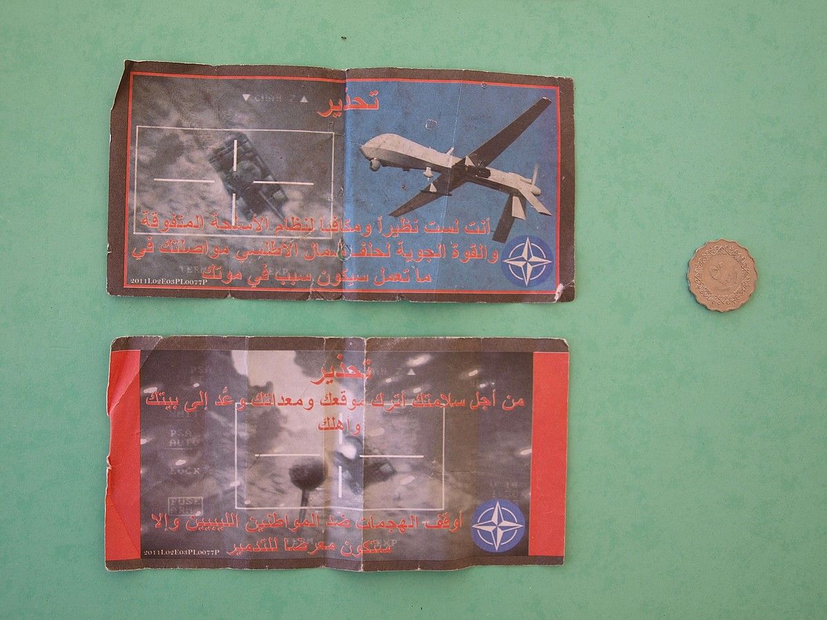 Egun ez da erraza NATOk Muammar Gaddafiren aldekoak kikiltzeko zabaldutako panfletoak aurkitzea Tripoliko kaleetan, baina, zortea lagun, oraindik ere topa litezke kaleko zabor eta gerra erraileen artean. Antza, piloturik gabeko hegazkinen aroan, II. Mundu Gerraren garaiko panfletoen modukoak ere erabiltzen dira. BERRIAk batzuk eskuratu ditu egunotan.