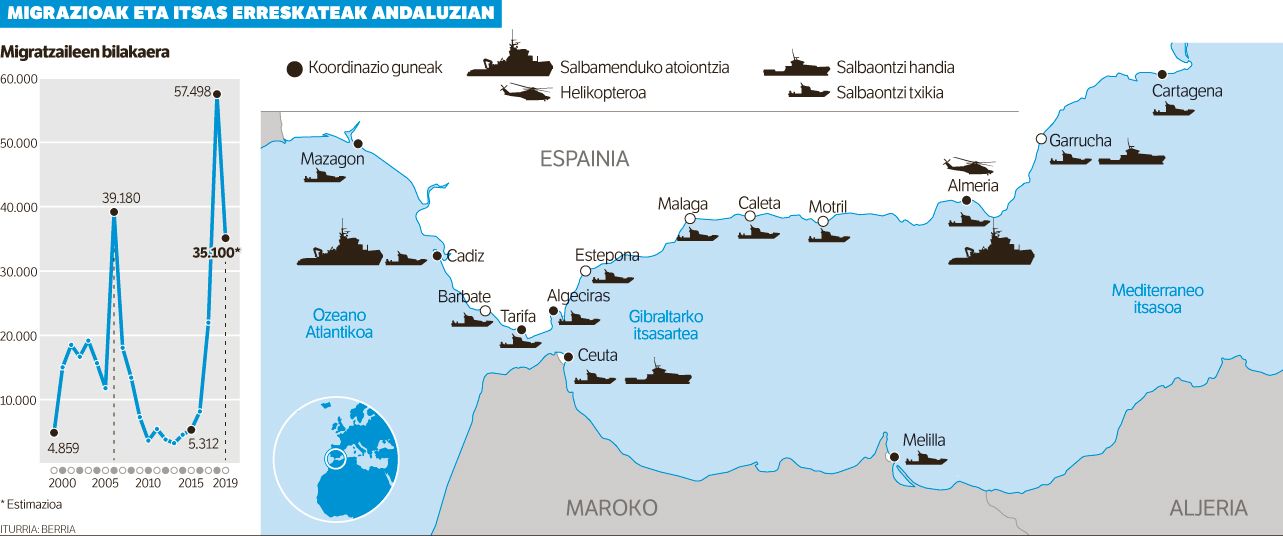 Izan ere, kontinenteko gainerako mugak itxita, Europarako sarbide nagusi bihurtu zen iaz Espainiako hegoaldea. APDHAren arabera, 64.000 pertsona baino gehiago iritsi ziren: 57.500, itsasoz, Cartagena (Murtzia) eta Cadiz (Andaluzia) arteko eremura, Gibraltarko itsasartea edo Alborango itsasoa gurutzatuta; lurrez sartu ziren beste 6.500 Ceuta eta Melilla hirietara. Oso igoera handia izan zen: 2017an, 28.500 pertsona heldu ziren hegoaldeko mugara, eta 2016an, 14.000. Itsasoan hildakoen kopuruak ere aurreko urteetako markak gainditu zituen: gutxienez 1.064 pertsonak galdu zuten bizia, baina 565 lagunen gorpuak ez dira agertu oraindik.
